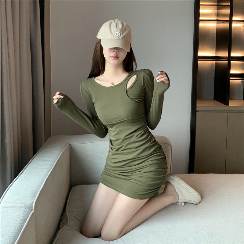 オータムショートスカート ウェストラウンドネックストラップレスプリーツドレス レディース ロング 秋物 Oネック Xiaofeijia4495653069