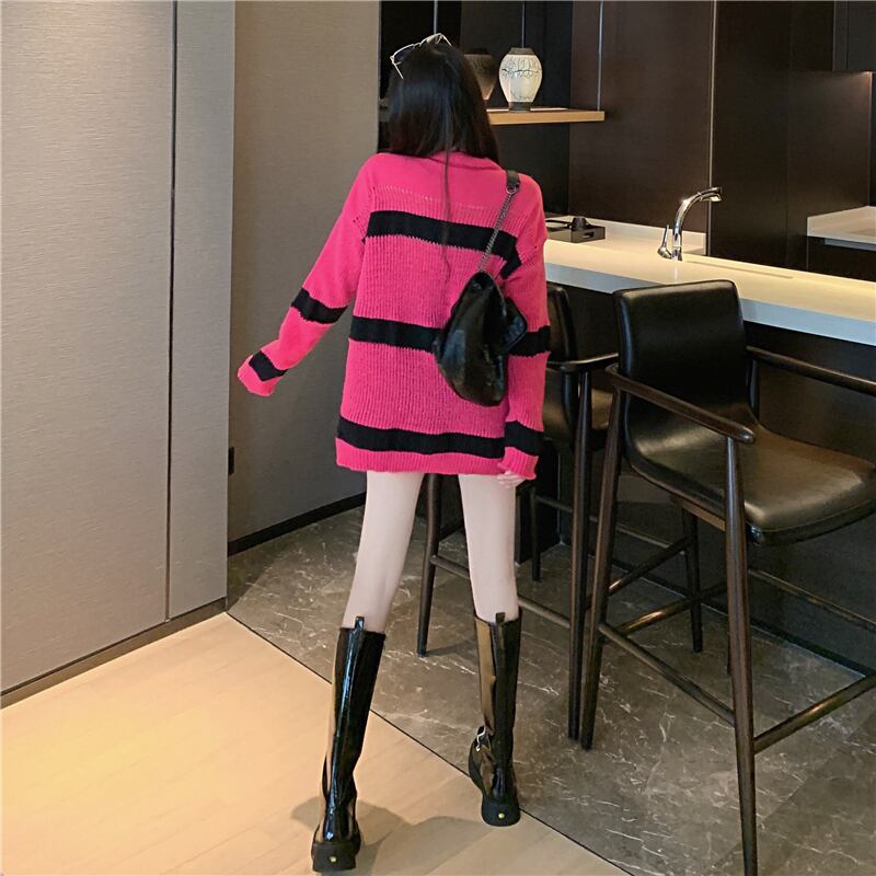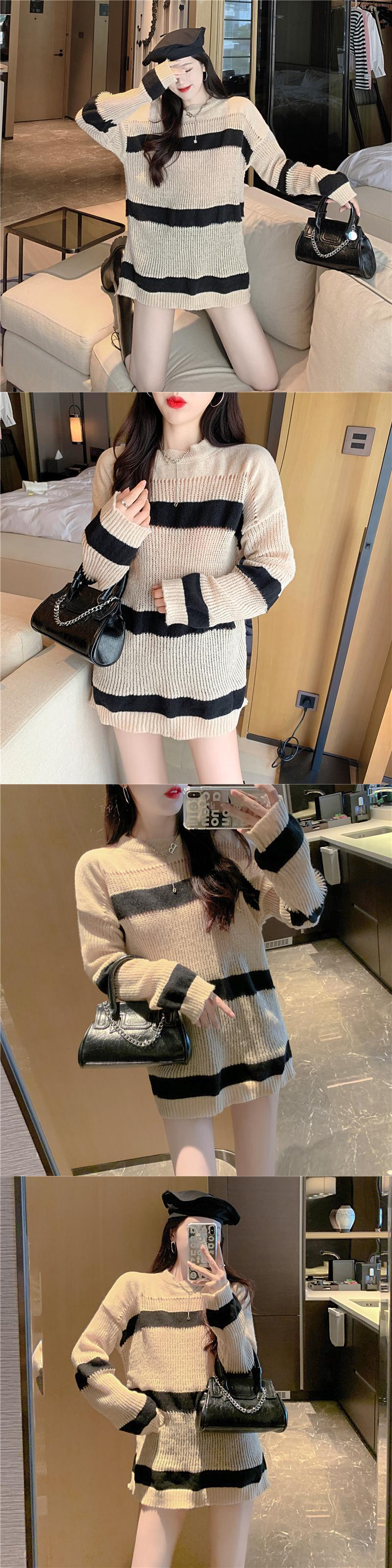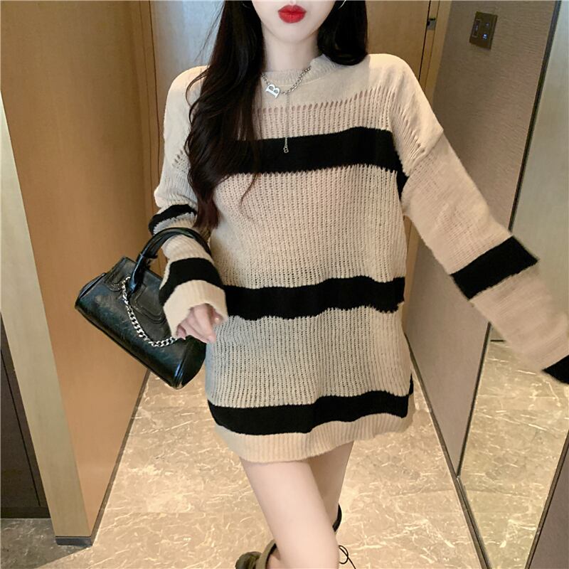 ストライプセーター レディースルーズプルオーバー オータムトップス ロング 秋物 Xiaofeijia64167273800