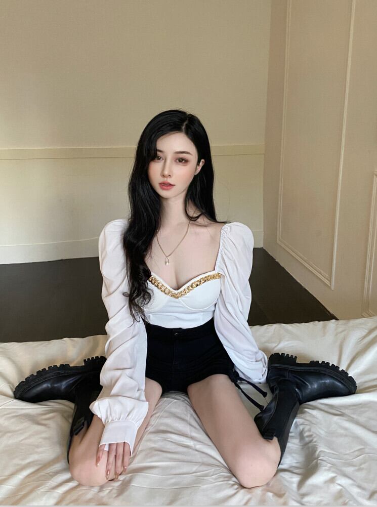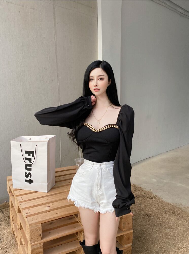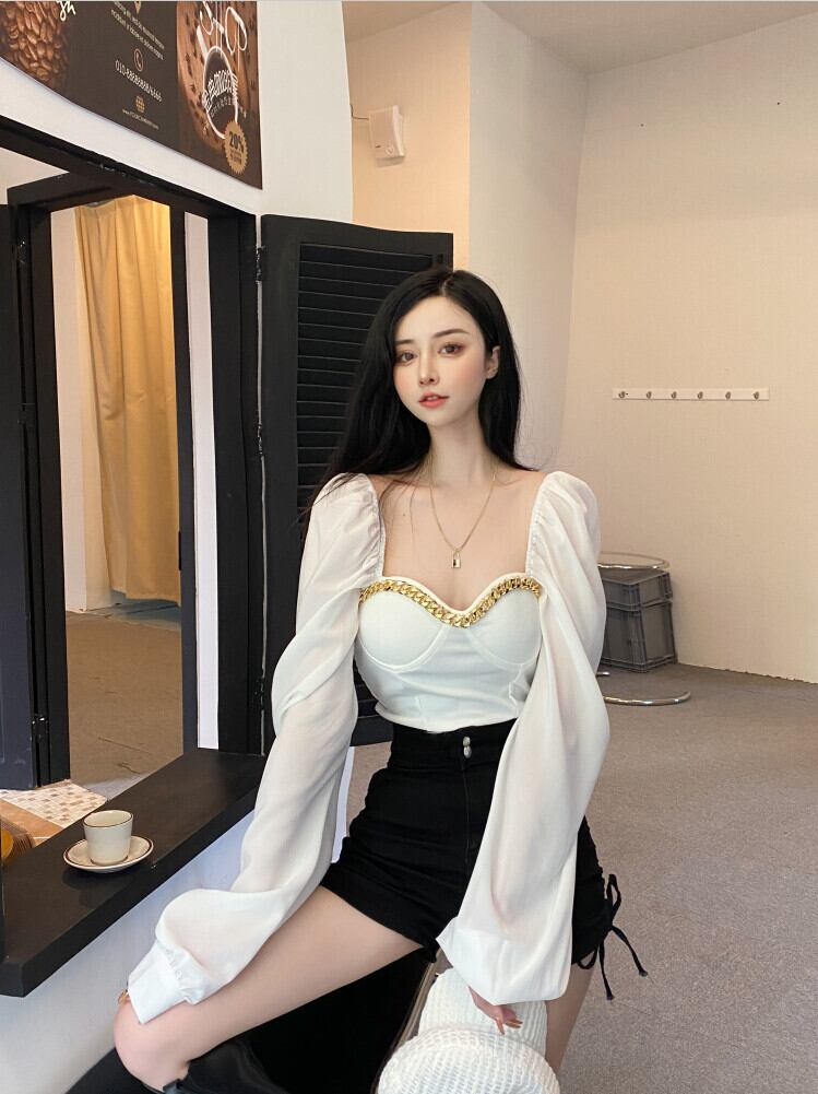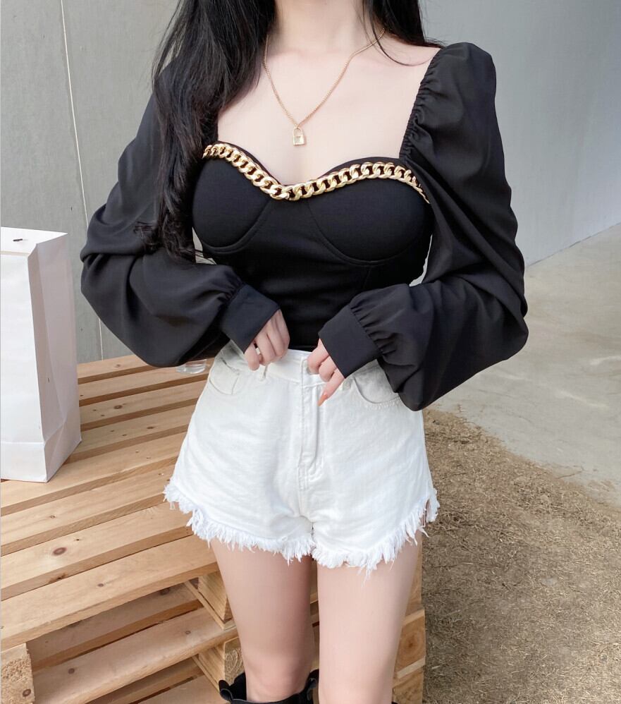 チェーン スリムショートトップス 長袖スリーブシャツ ロング スクウェア Xiaofeijia80734669049