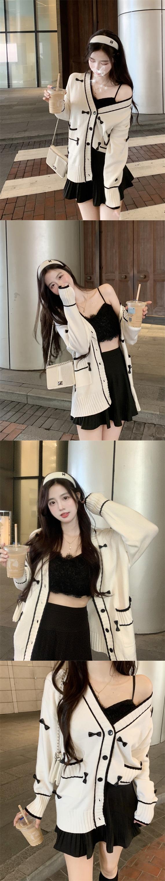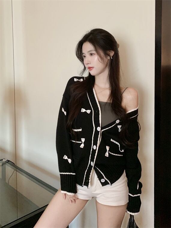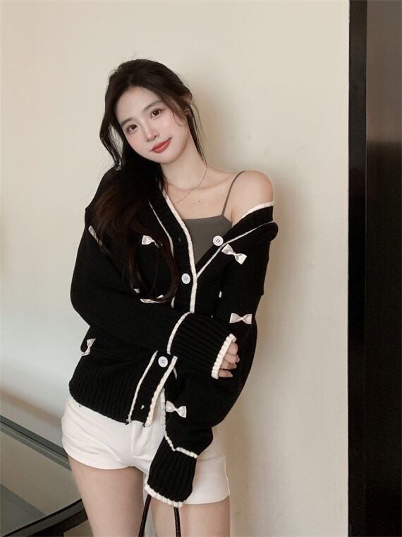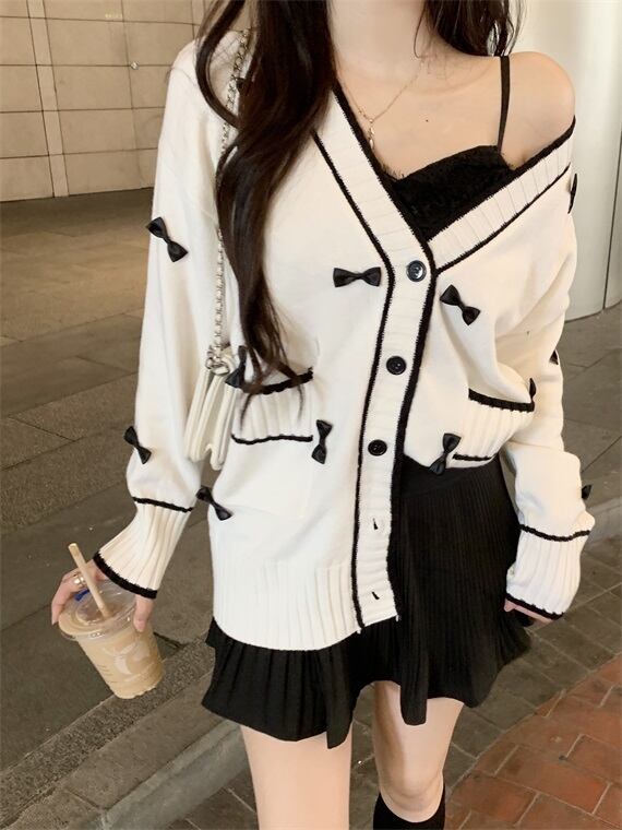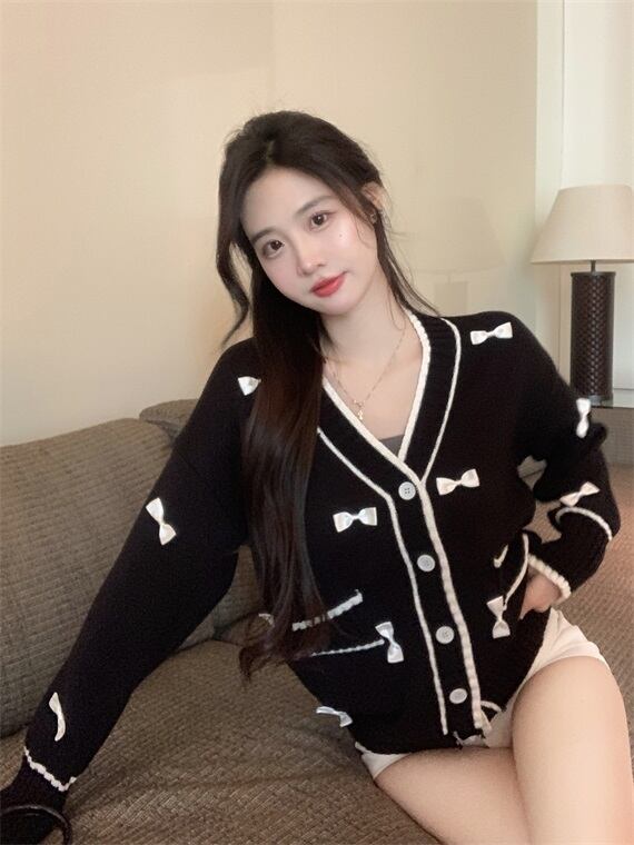 セーター ジャケット カーディガンレディースオータムVネックルーズニットトップス リボン 大人ガーリー スウィート キュート カジュアル 秋物 Xiaofeijia18786674916