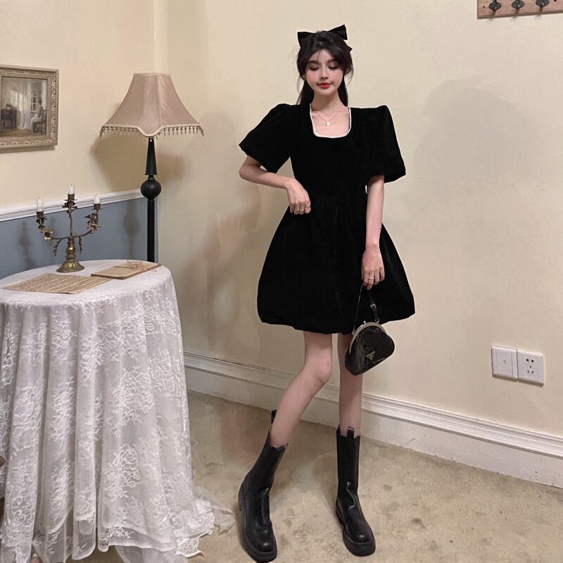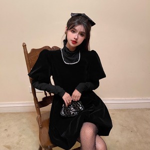 ベルベットFlowerデザイン ハイウェストスリーブドレス ブラック ロング フラワーデザイン Xiaofeijia27065362790