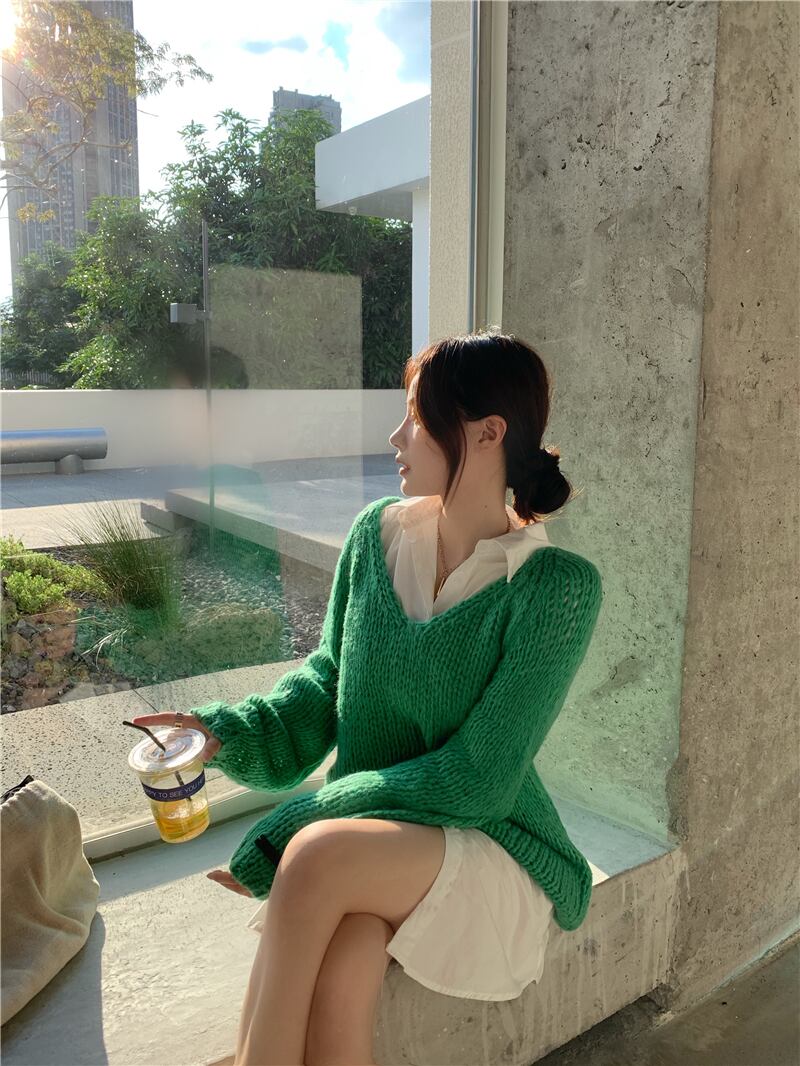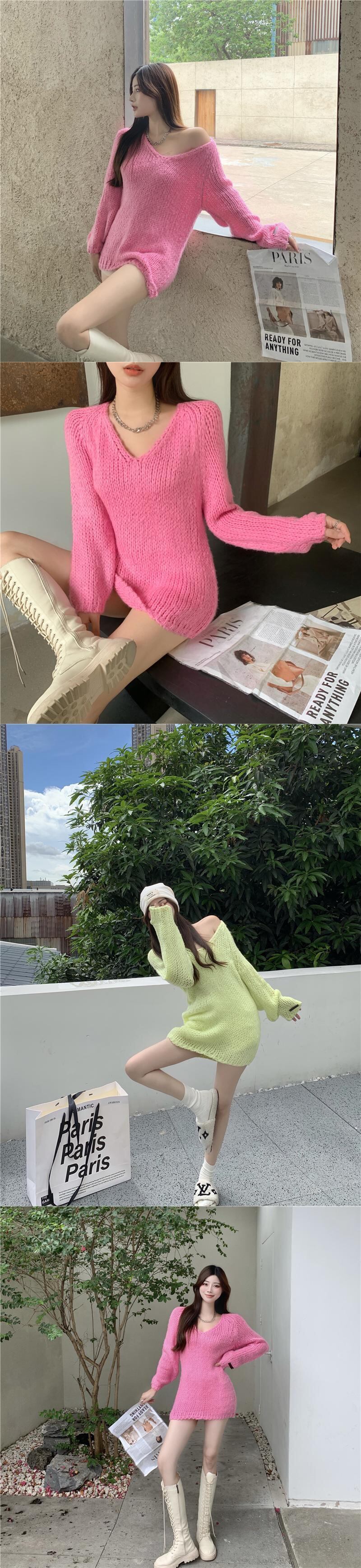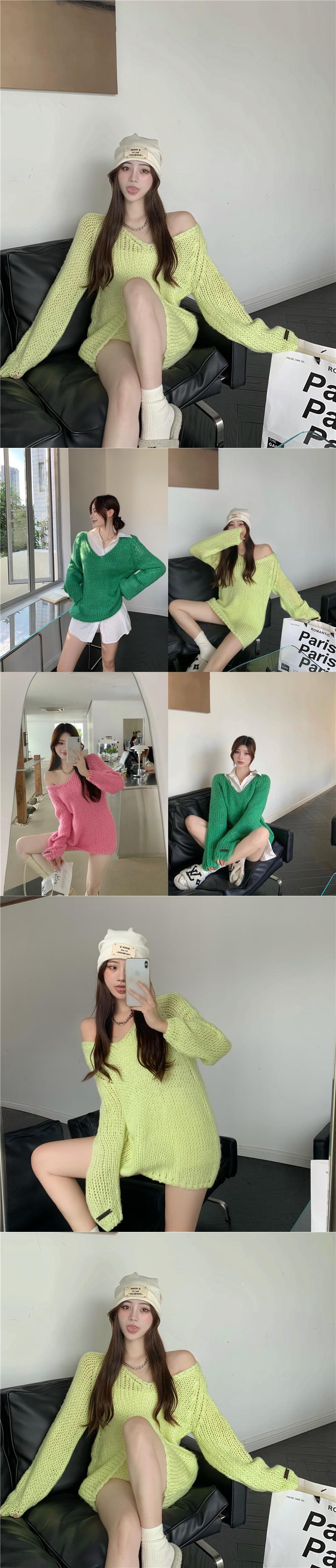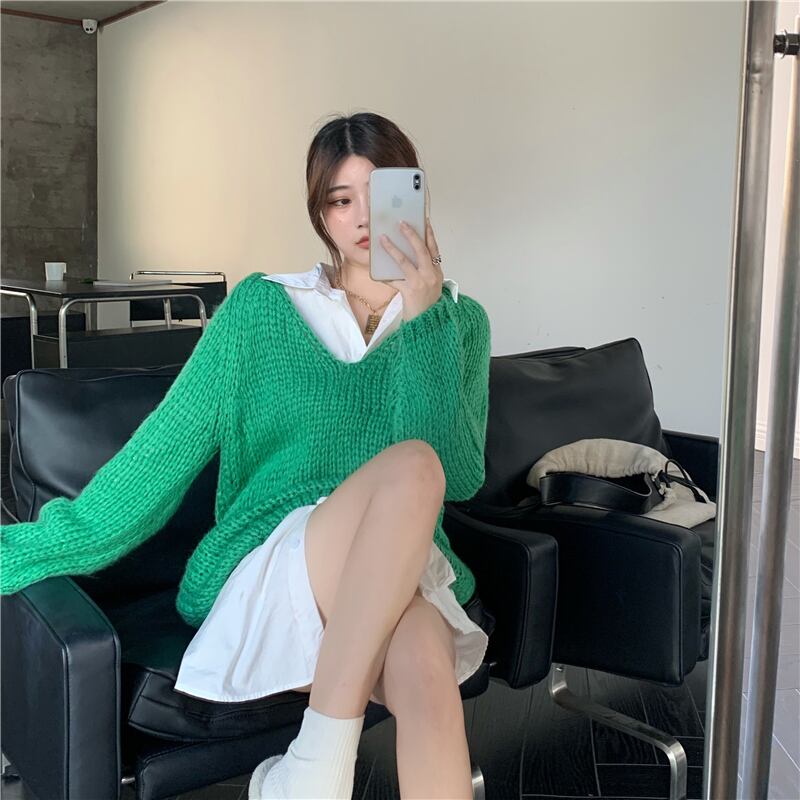 カラーVネックセーター オータムスタイルルーズニットトップス ロング 秋物 Xiaofeijia34628642673