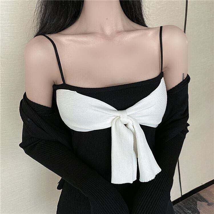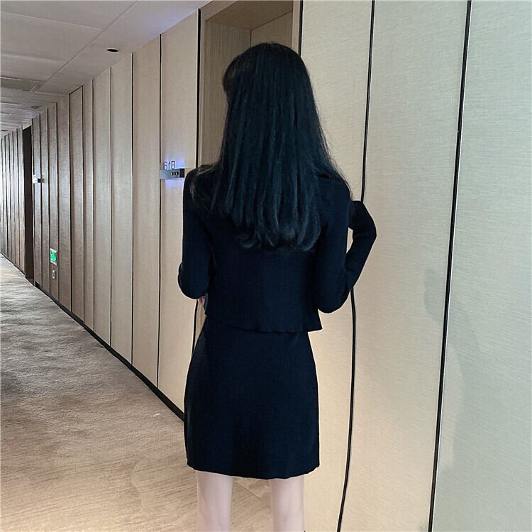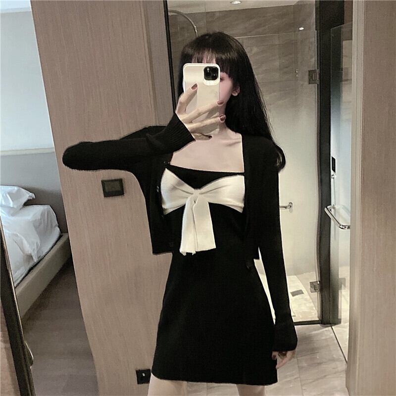 オータムドレス ショート長袖スリーブカーディガンニットセット ロング リボン 秋物 Xiaofeijia19294147693
