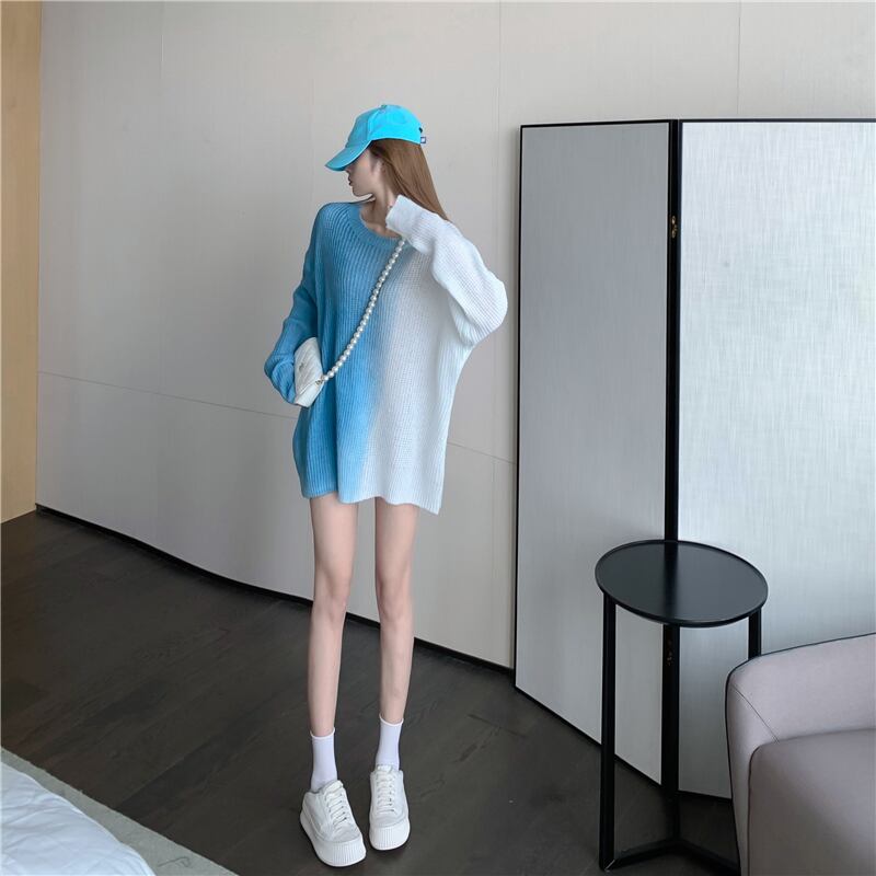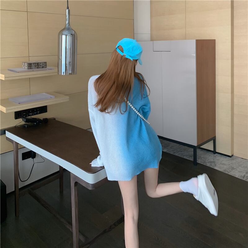 プルオーバー ルーズブルーニットセーター オータムウィンタートップス ロング 秋物 冬物 Xiaofeijia16990129926