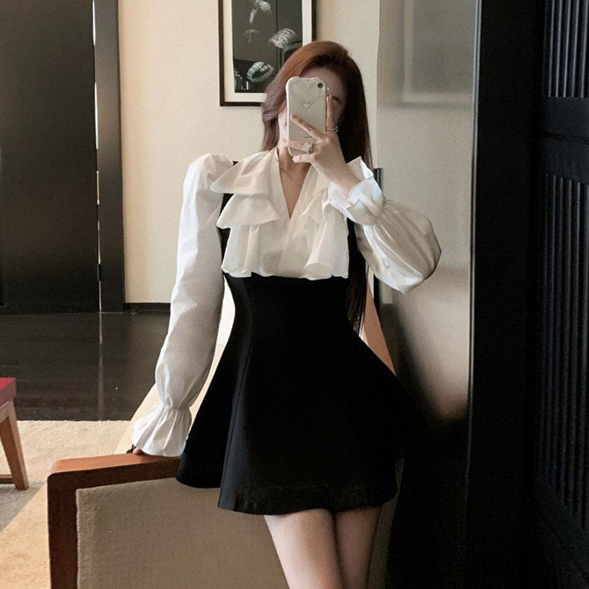 オータムVネックシャツ ウェストドレス スカート レディース 秋物 Xiaofeijia65334935189