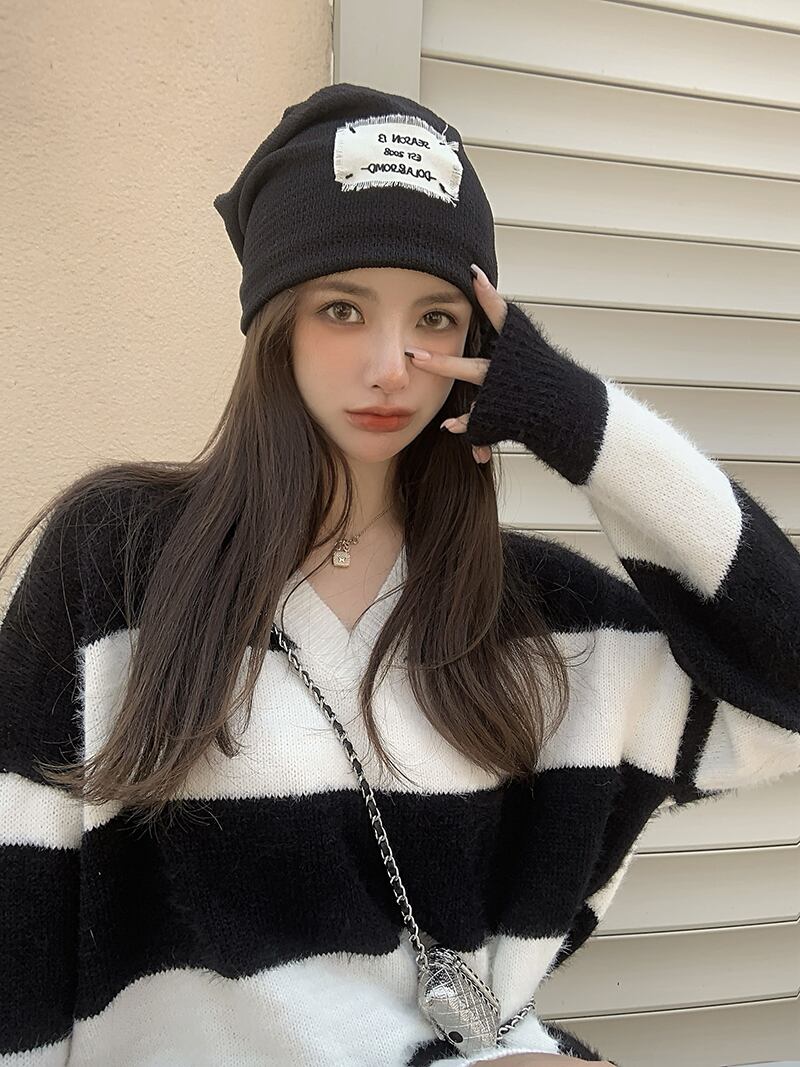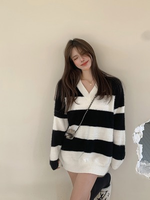 オータムVネックセーター トップス ルーズストライプ ロング 秋物 Xiaofeijia76000592842