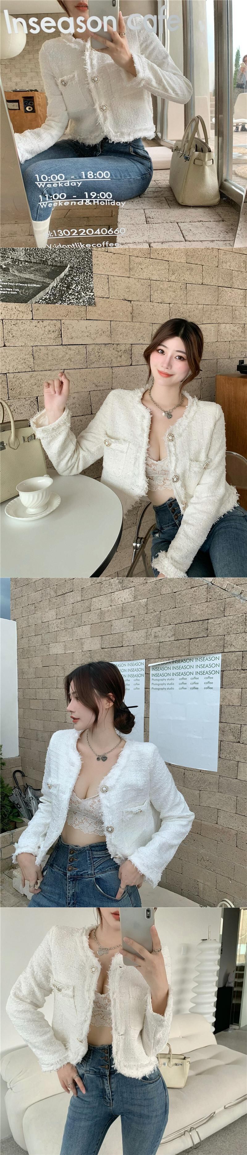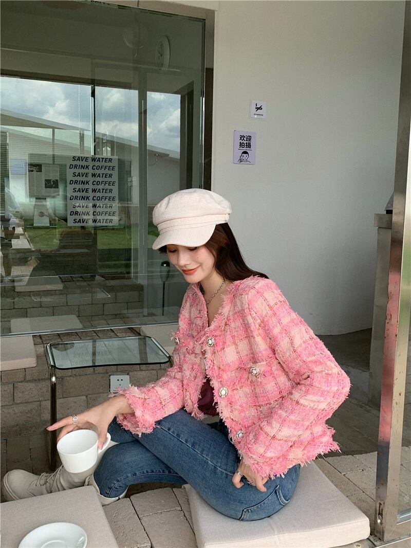 スタイルオータムウィンタージャケット レディースツィードカーディガンラウンドネックショートトップス ロング ピンク 秋物 冬物 Oネック Xiaofeijia6057962629