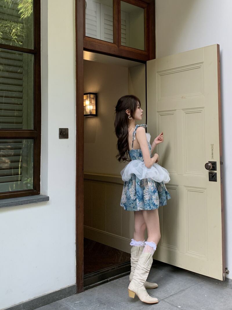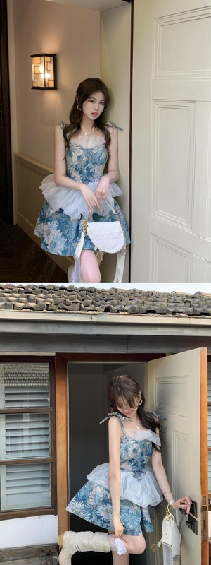 スタンダードショートスカート サマーフローラルリボンドレス レトロ 夏物 花柄 Xiaofeijia27487566735