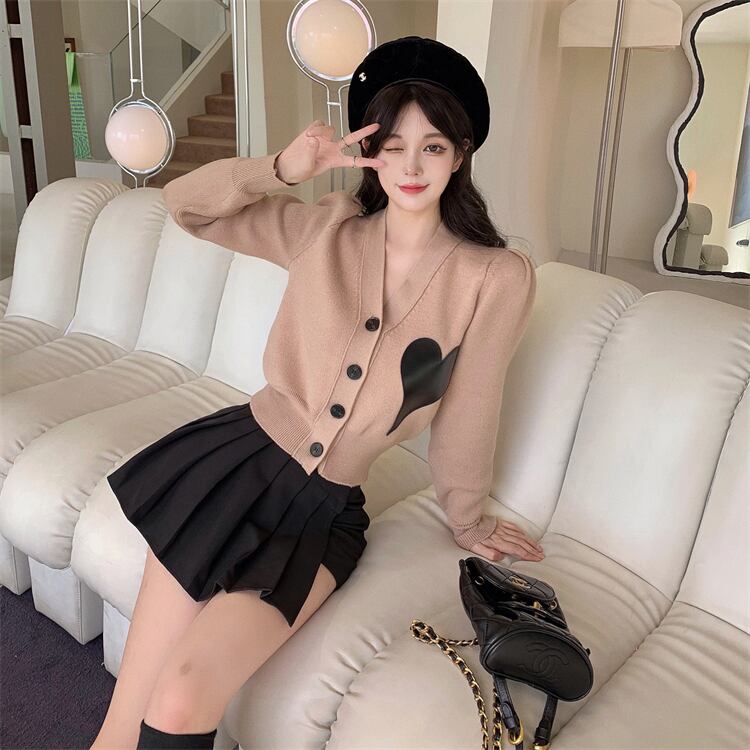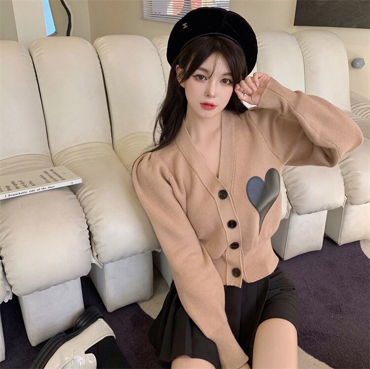 オータムスタンダードショートニットカーディガンウェストVネックセーター ジャケット 長袖スリーブトップス ロング レトロ 秋物 Xiaofeijia43585568895