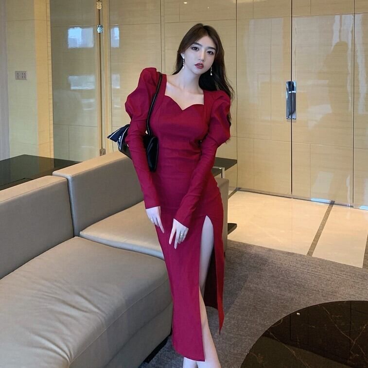 スタンダードスリーブスリムロングドレス スリット レトロ Xiaofeijia99964610656