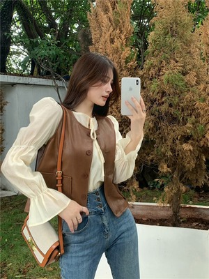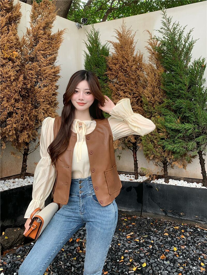 レザーオータムノースリーブジャケット ショートスタンダードルーズ レトロ 秋物 Xiaofeijia91665183636