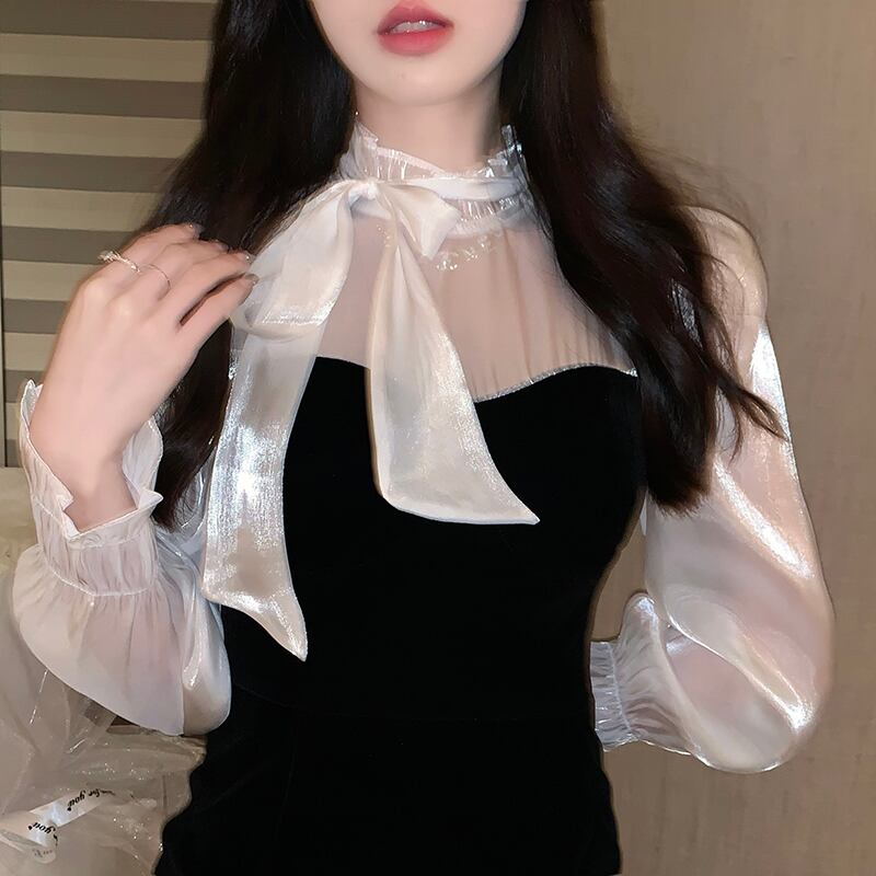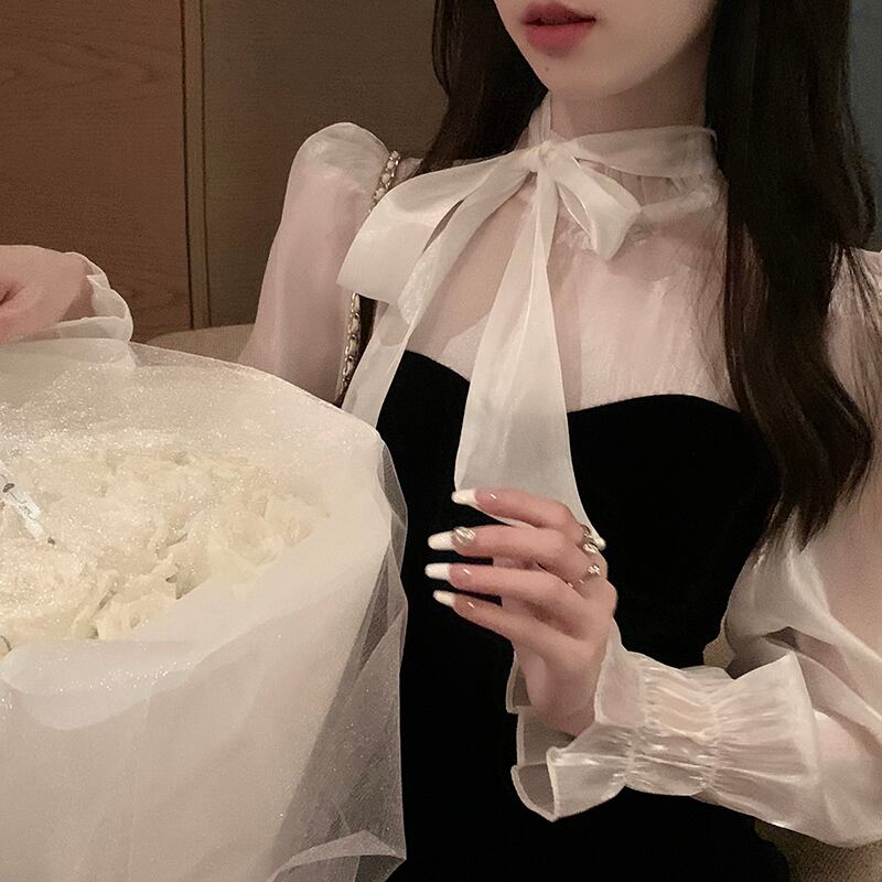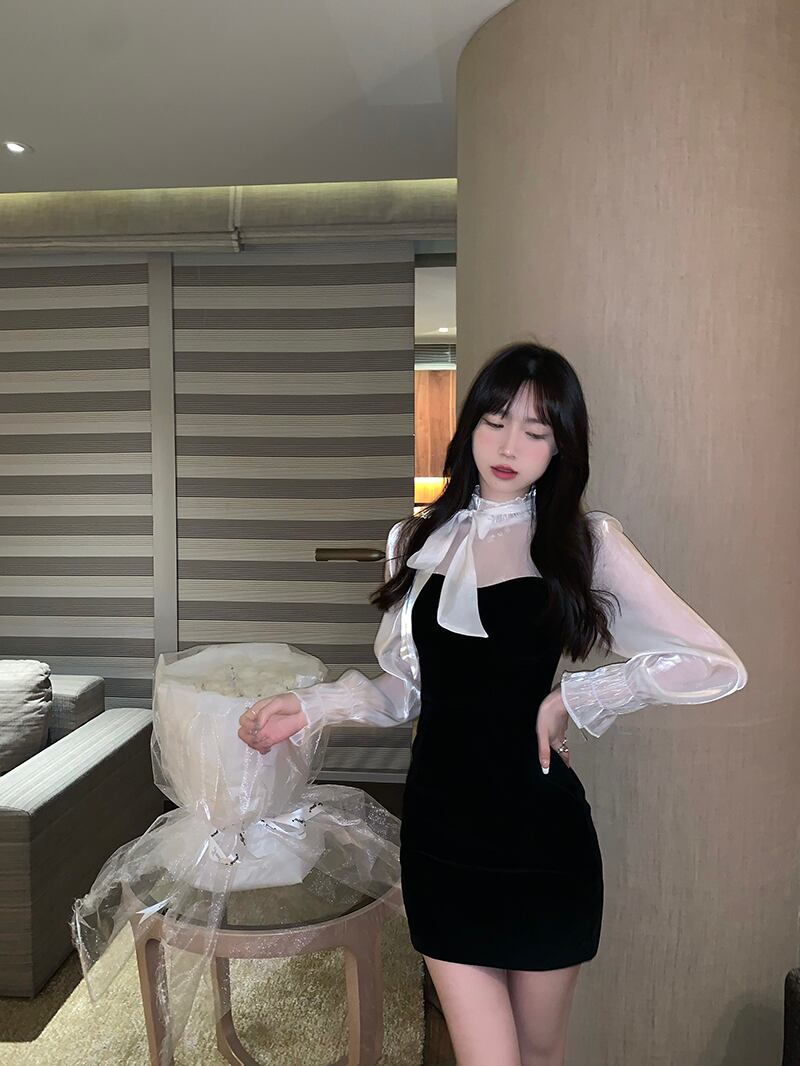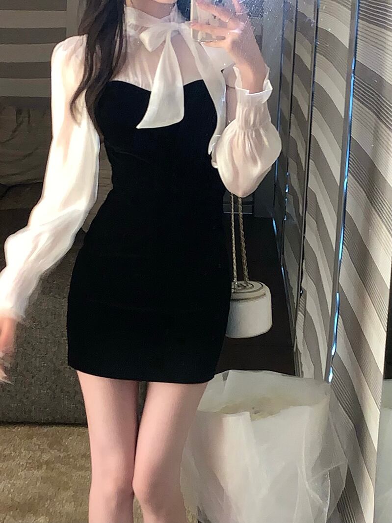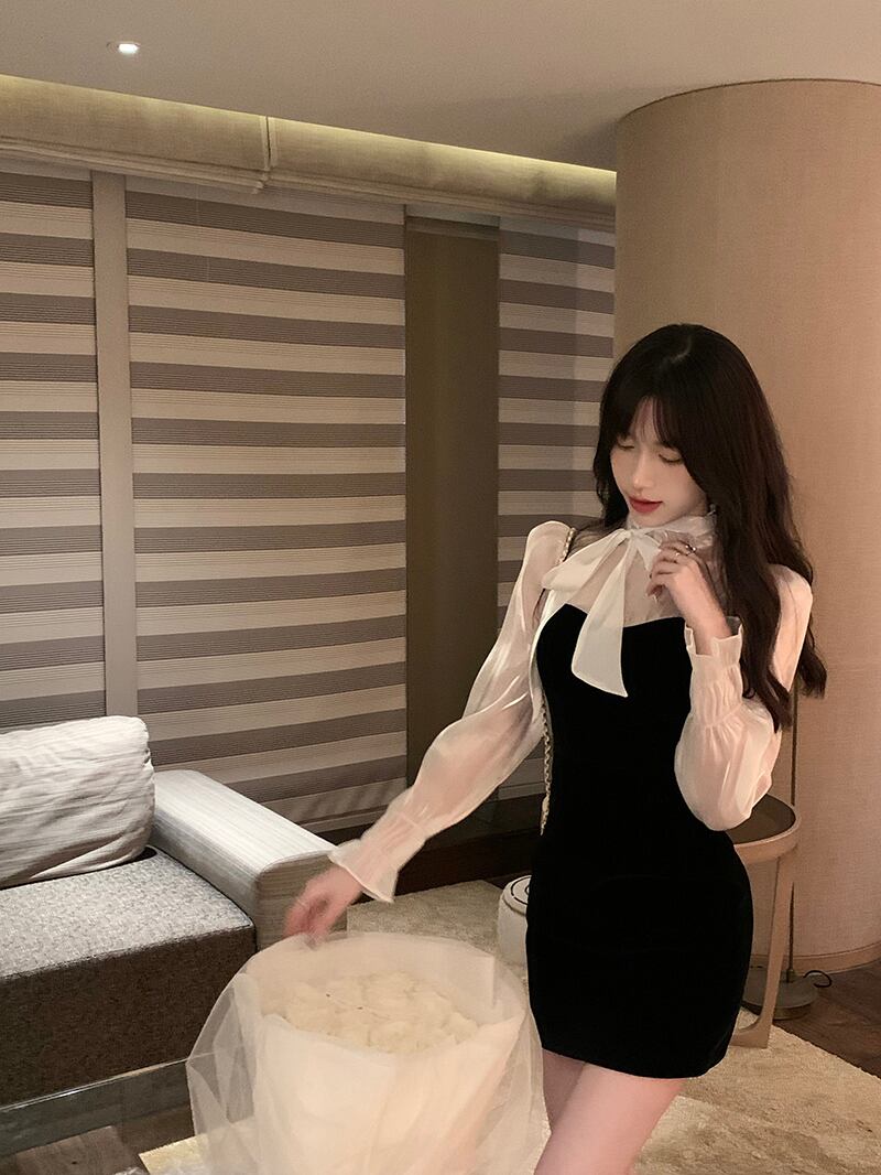 オータムブラックドレス リボンベルベットスカート 大人ガーリー スウィート キュート カジュアル 秋物 ピュア ステッチ Xiaofeijia68377494240