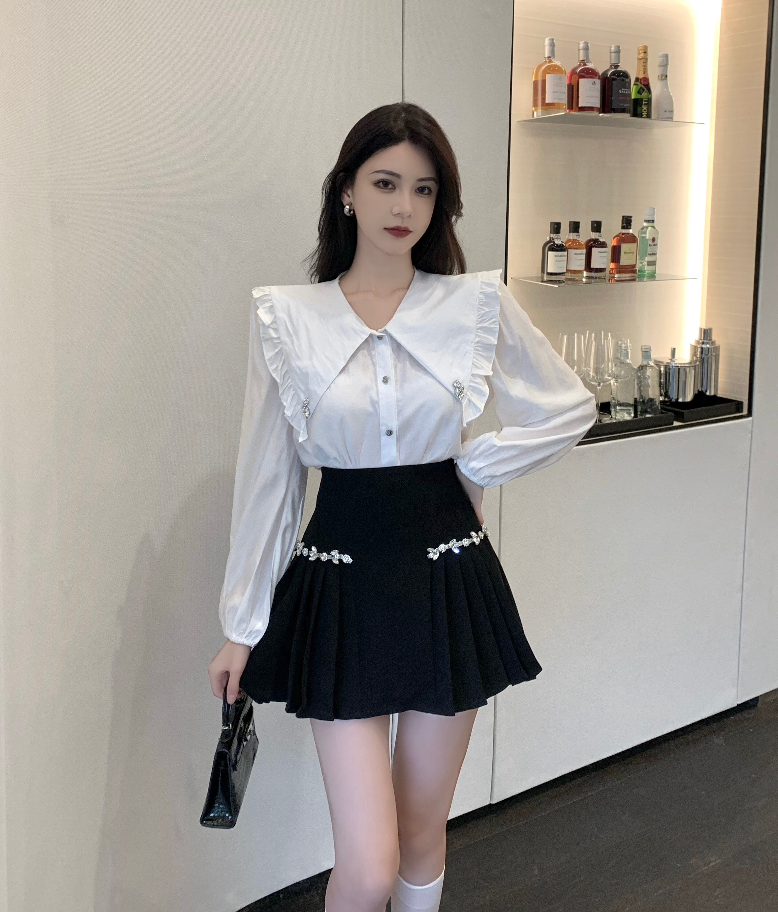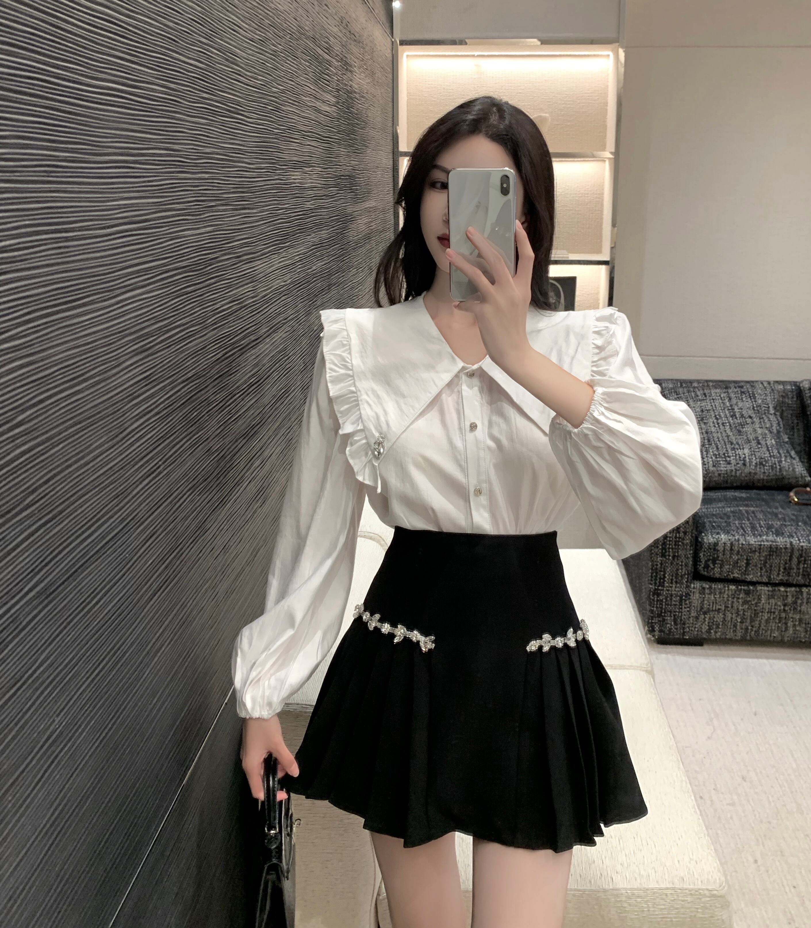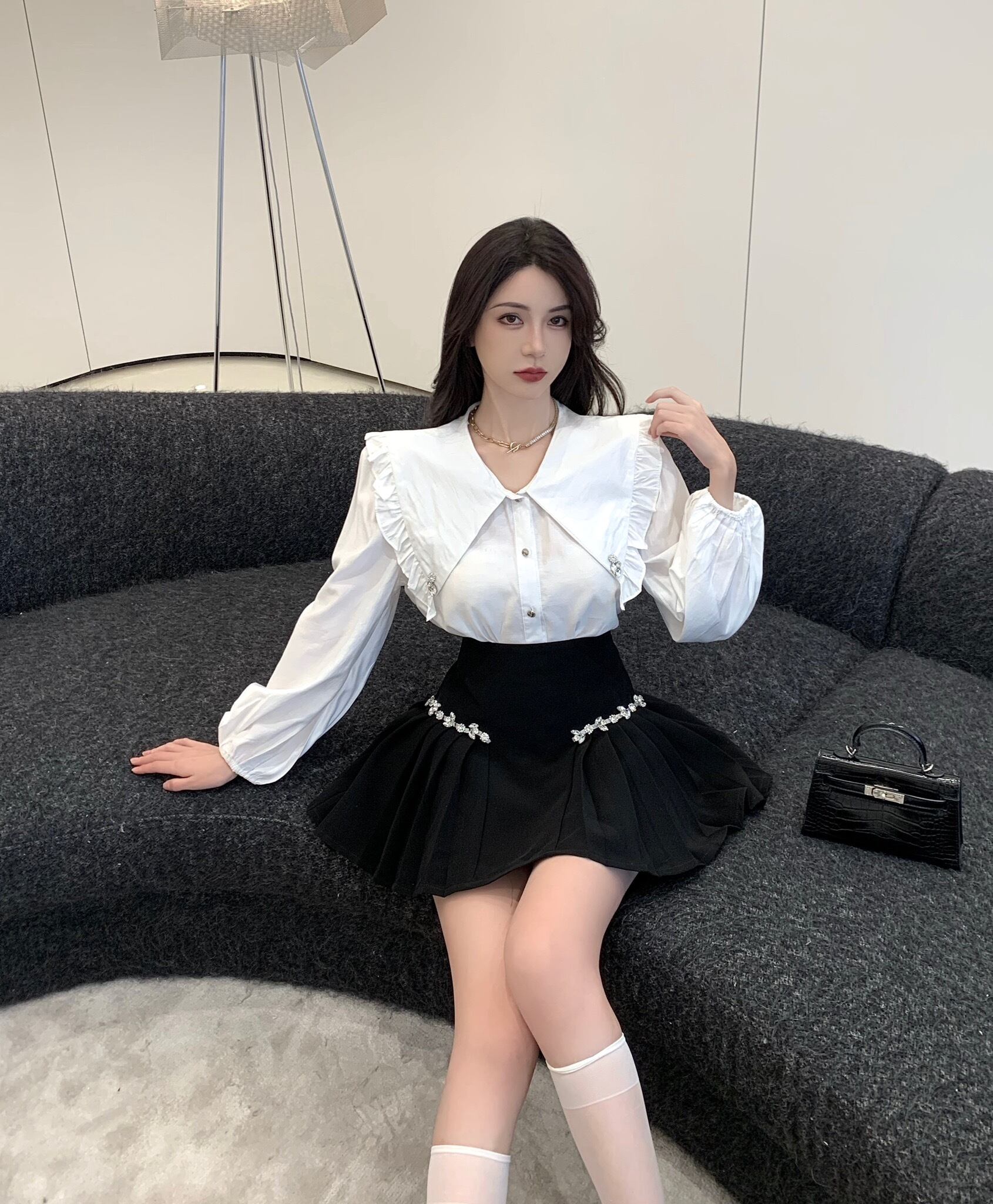 カラーシャツ ハイウェストウェストプリーツスカート スタイル Xiaofeijia80195608396