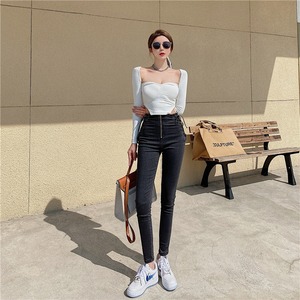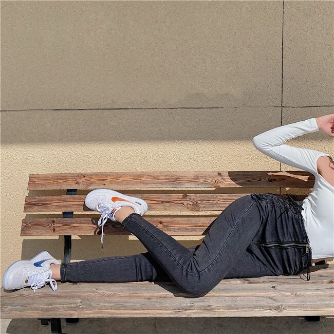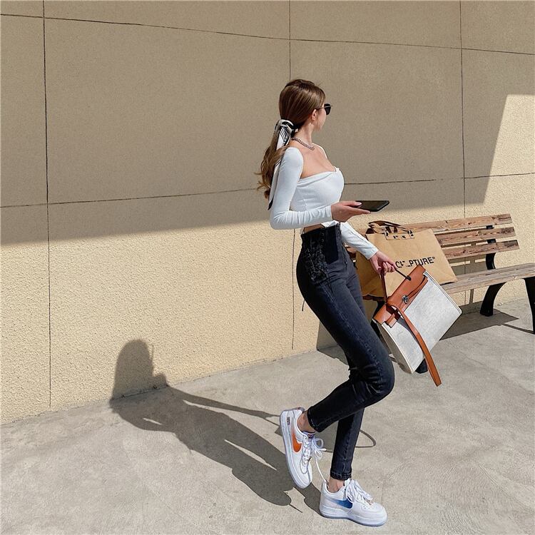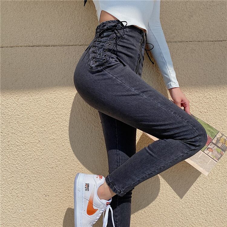 クロスレースジッパーハイウェストウェストカジュアルジーンズ Xiaofeijia30780473163