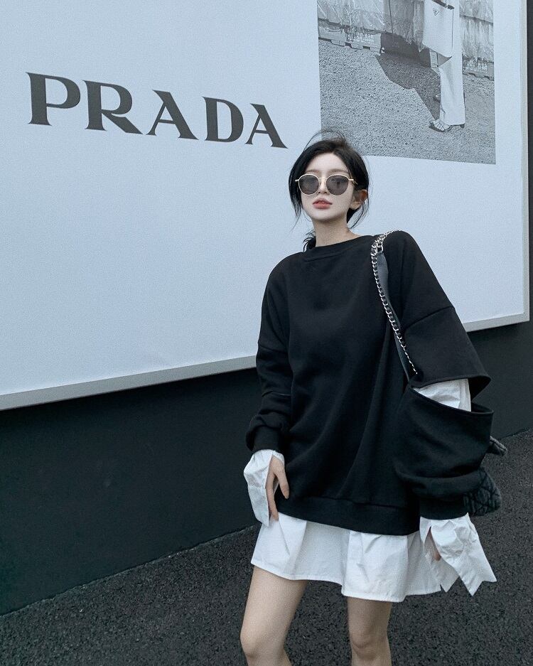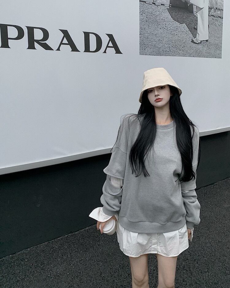 長袖スリーブセーター レディースオータムルーズラウンドネックトップス ロング ストリート 秋物 Oネック ステッチ Xiaofeijia35307334451