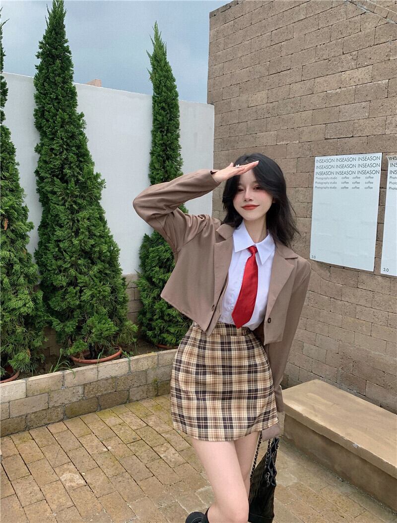 色:チェック柄スカート,ネクタイ付きシャツ,スーツ