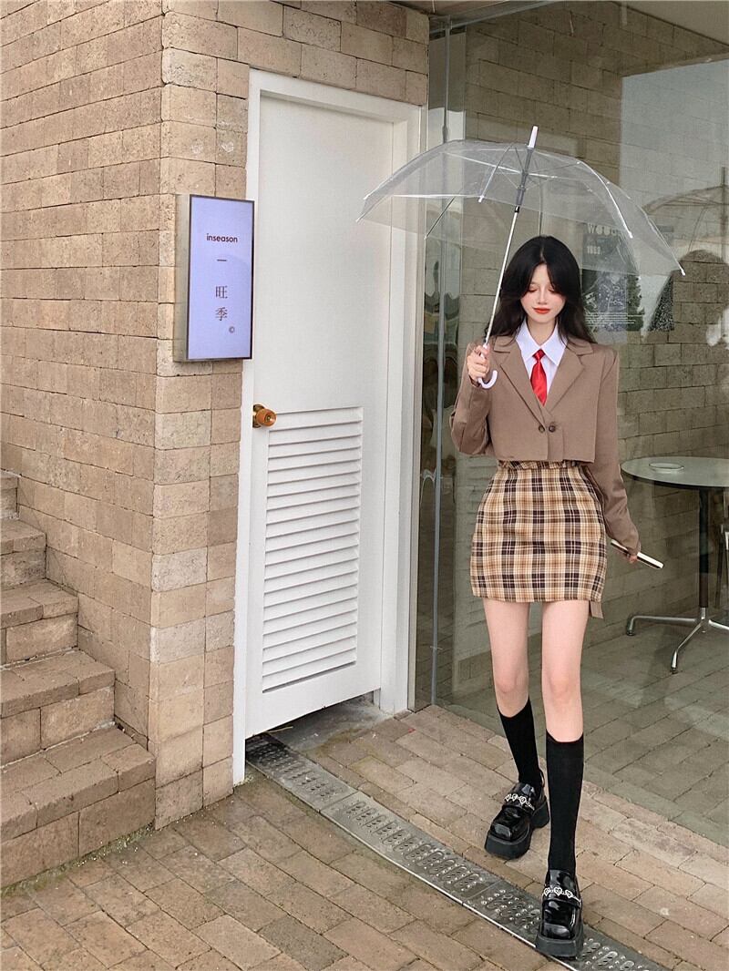 スタイルホワイトシャツ カーキハイウェストウェスト格子柄スカート Xiaofeijia52562477180
