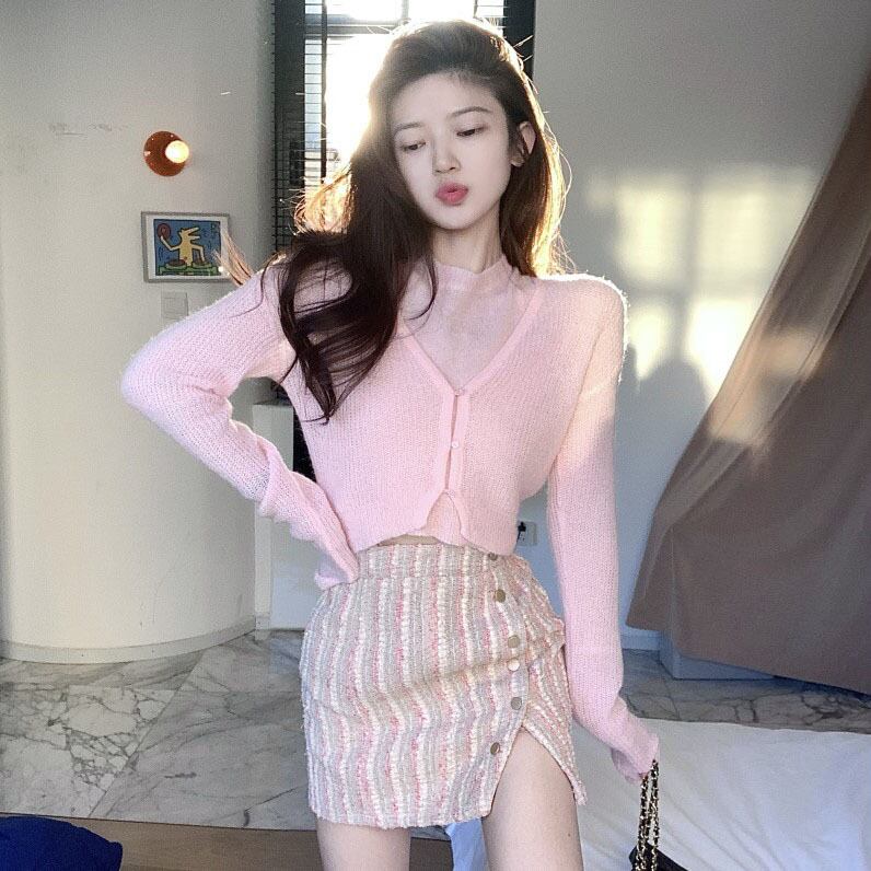Vネックニットカーディガン薄手セーター ジャケット オータムショートトップス ロング 秋物 Xiaofeijia82472199523
