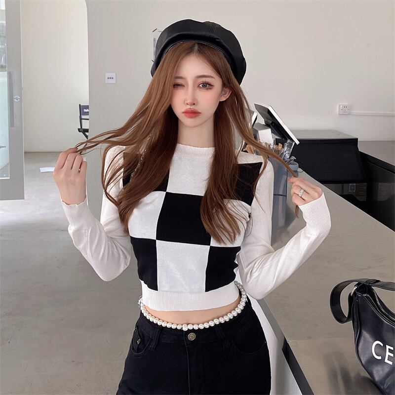 格子柄ショートセーター 薄手オータムスタンダード長袖スリーブニットトップス ロング レトロ 秋物 Xiaofeijia16053650291