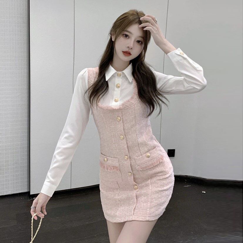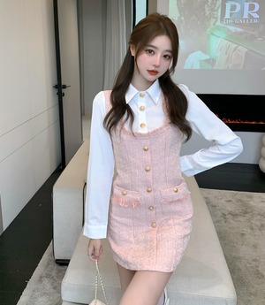 オータムスタイルドレス ピンク 大人ガーリー スウィート キュート カジュアル 秋物 ステッチ Xiaofeijia17602421657