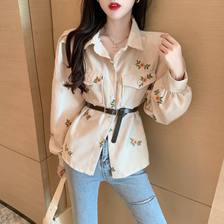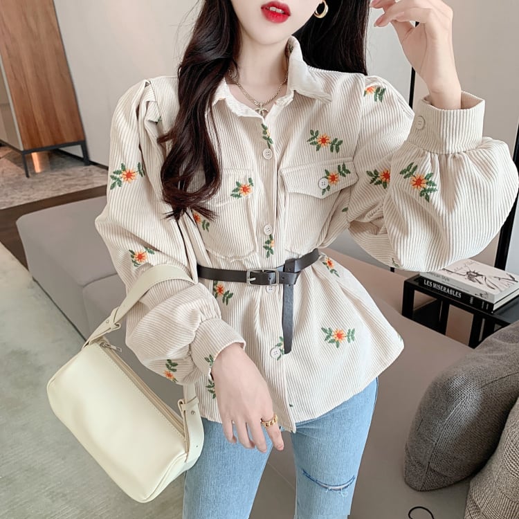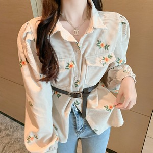オータムスタンダード刺繍Flowerデザイン シャツ コーデュロイルーズベルト トップス ロング レトロ 秋物 ハーネス フラワーデザイン Xiaofeijia75746468062