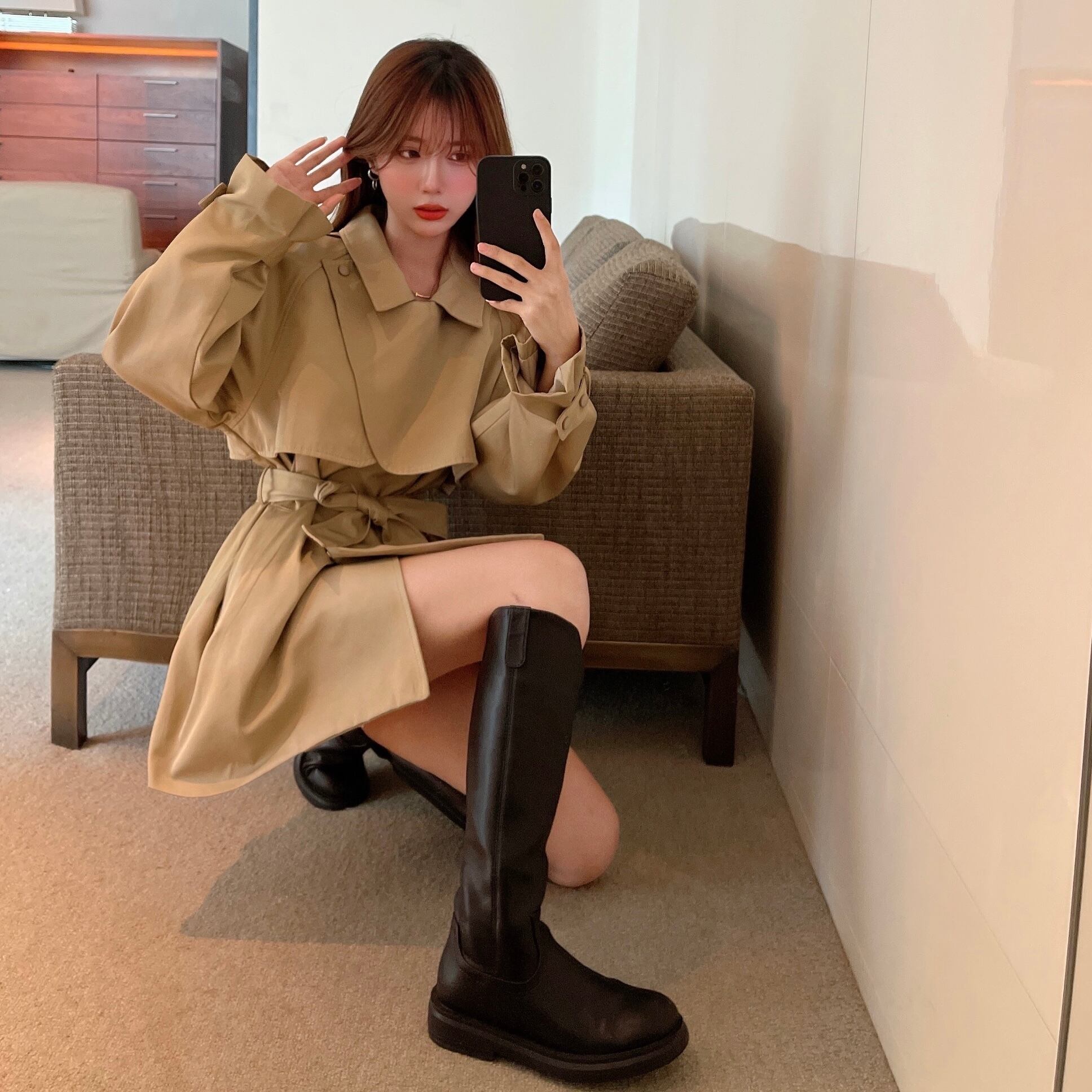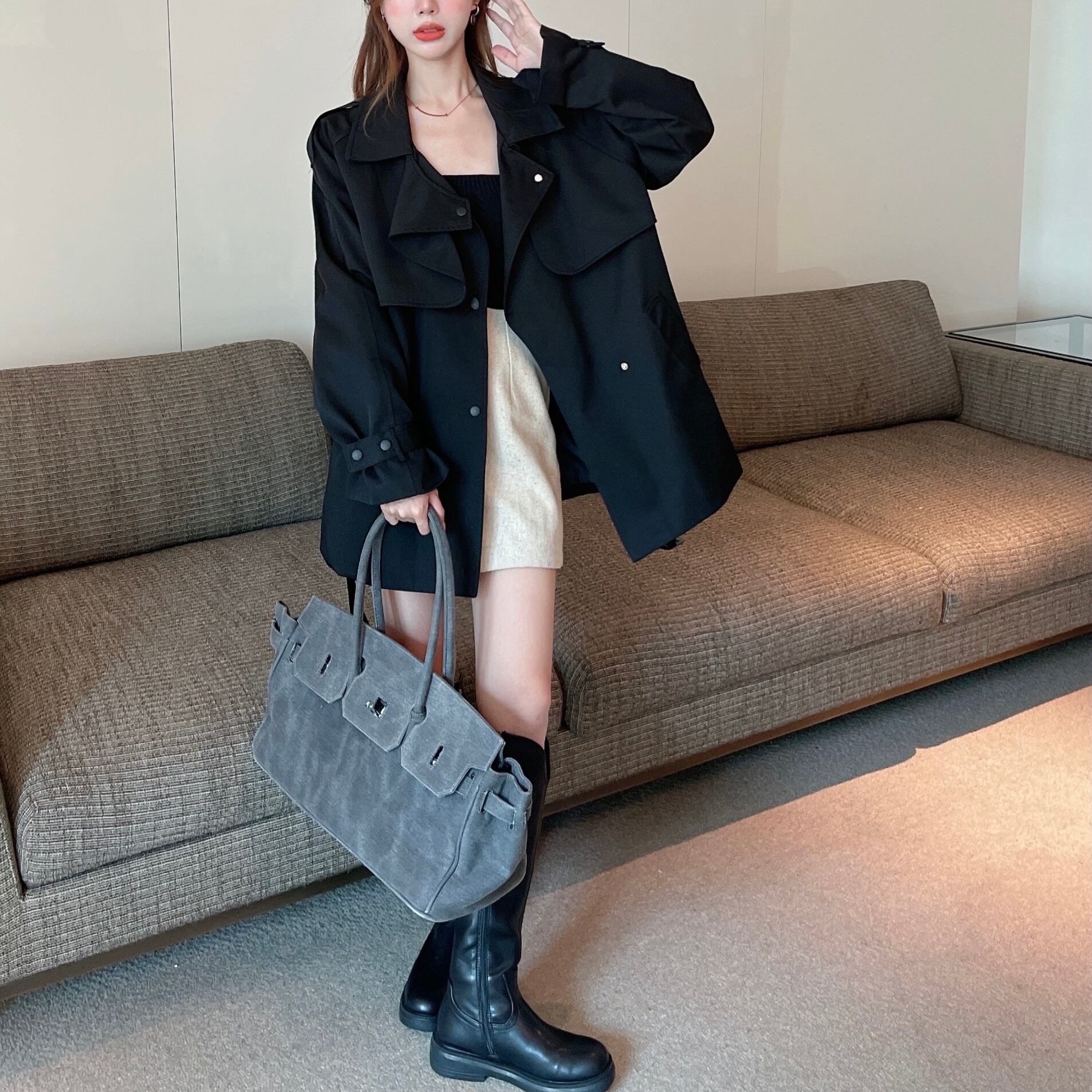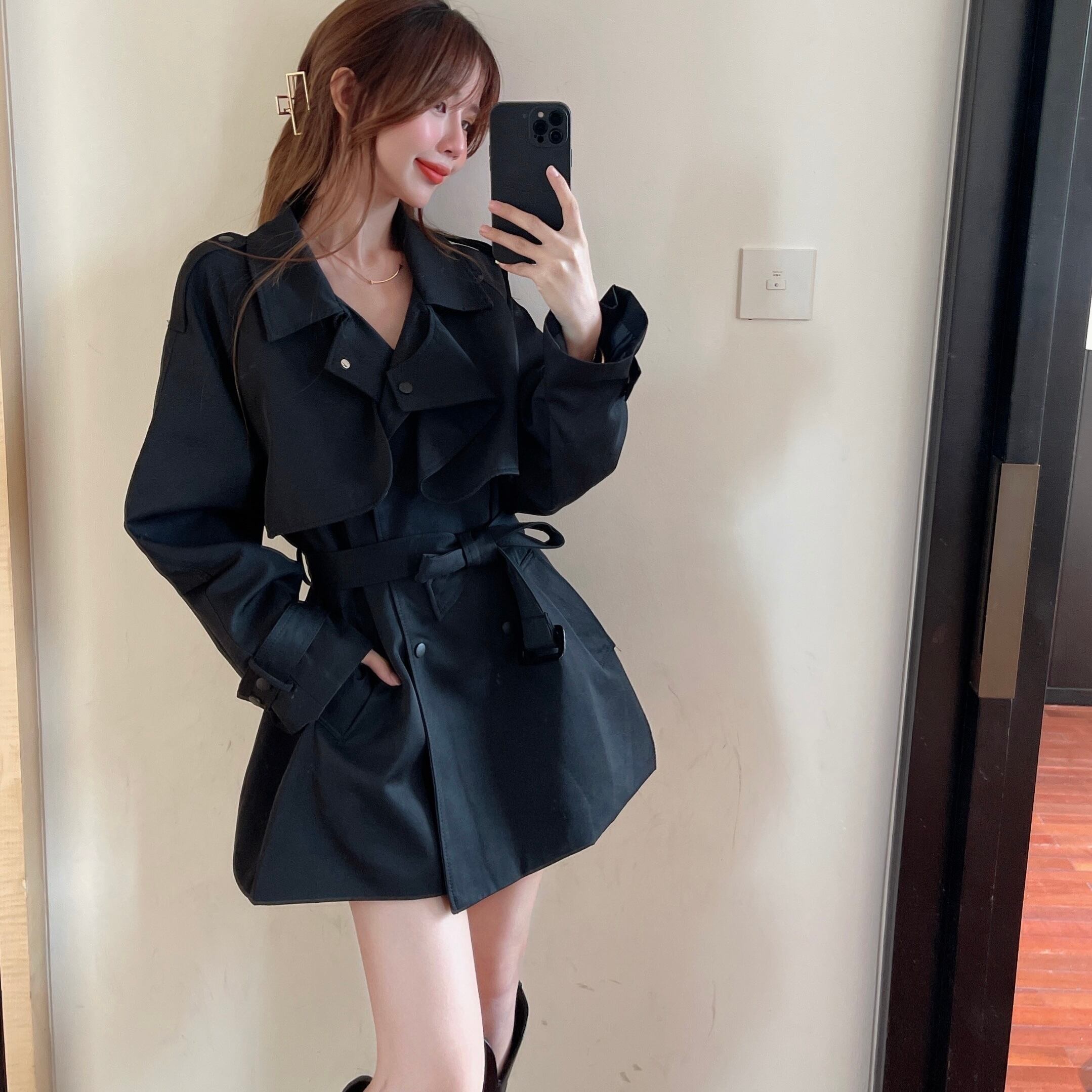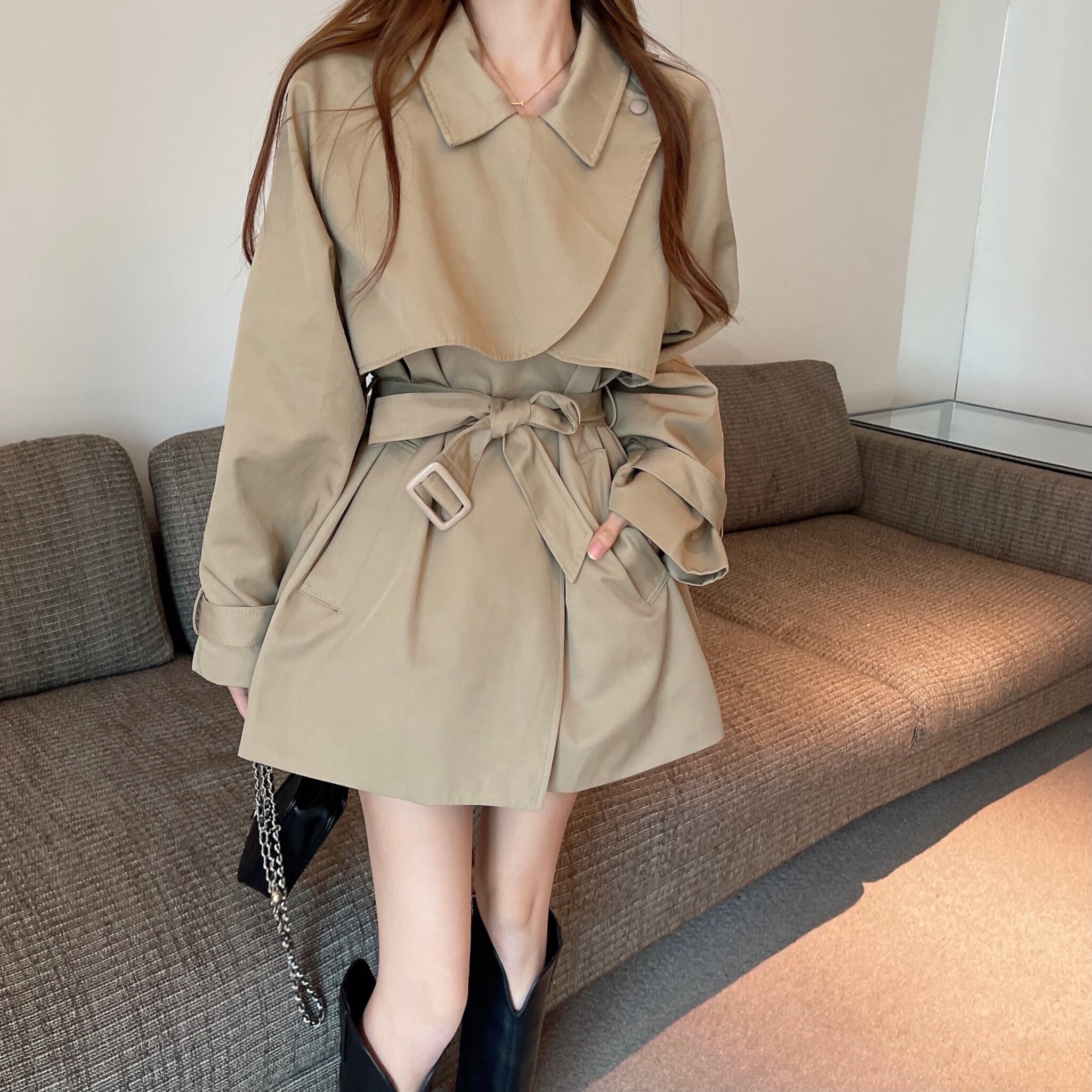 カーキショートコート ルーズウェストブラックジャケット レース レースアップ Xiaofeijia50309509424