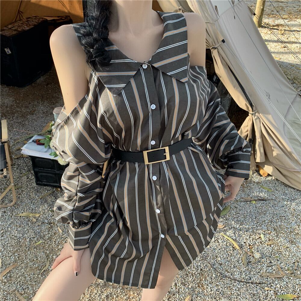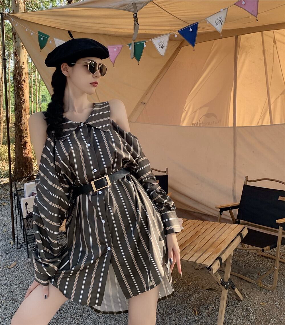 スタンダードルーズストライプドレス ストラップレスショートバックロング長袖スリーブシャツ レトロ Xiaofeijia73410778632