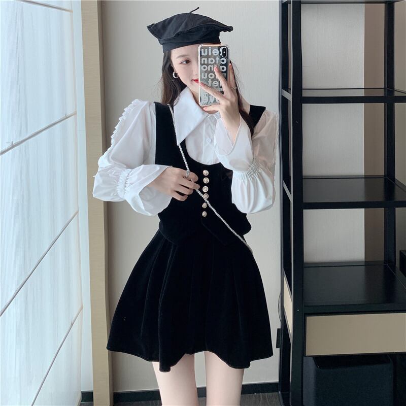 スタンダードブラックベルベットショートスカート シャツ レトロ ふわふわ Xiaofeijia82934905812