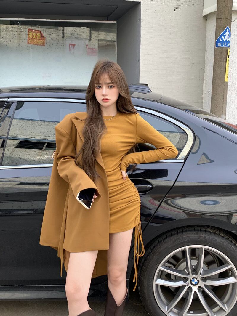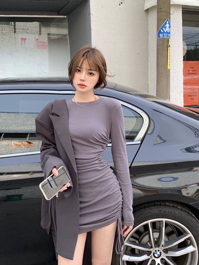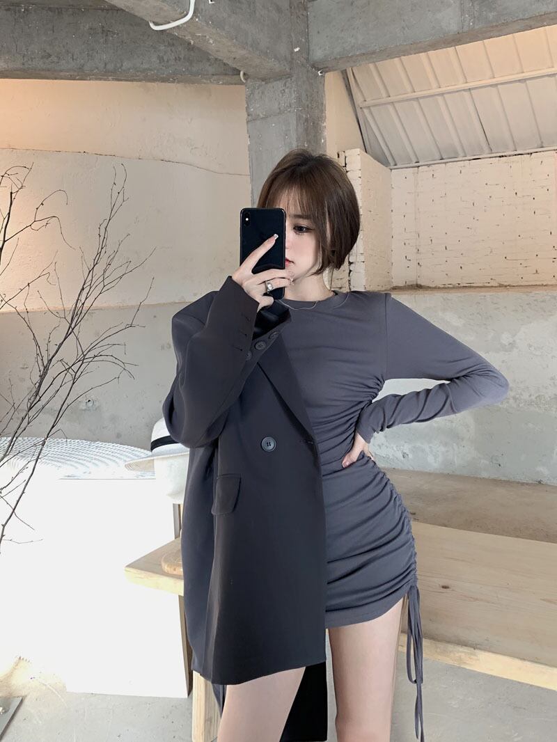 色:ダークグレーのスーツ,グレーの巾着スカート,黄色のスーツ,黄色の巾着スカート