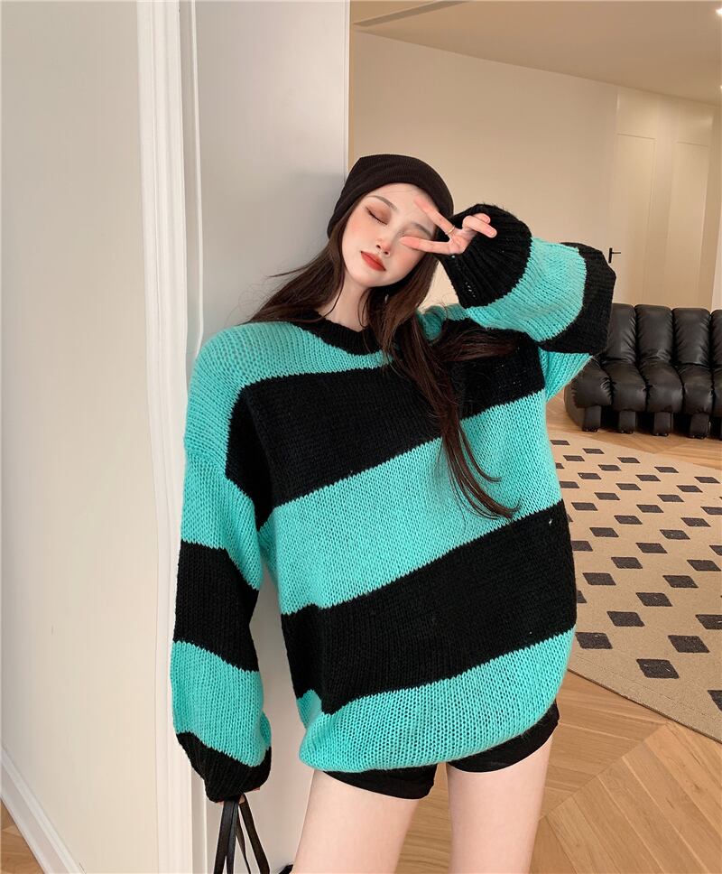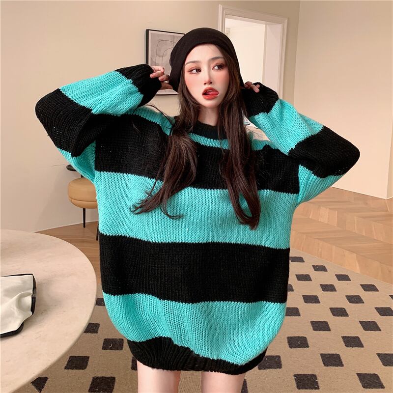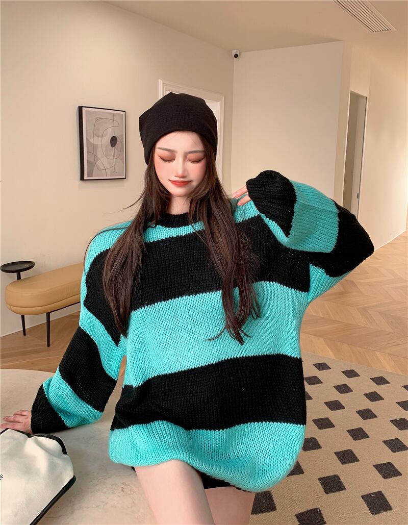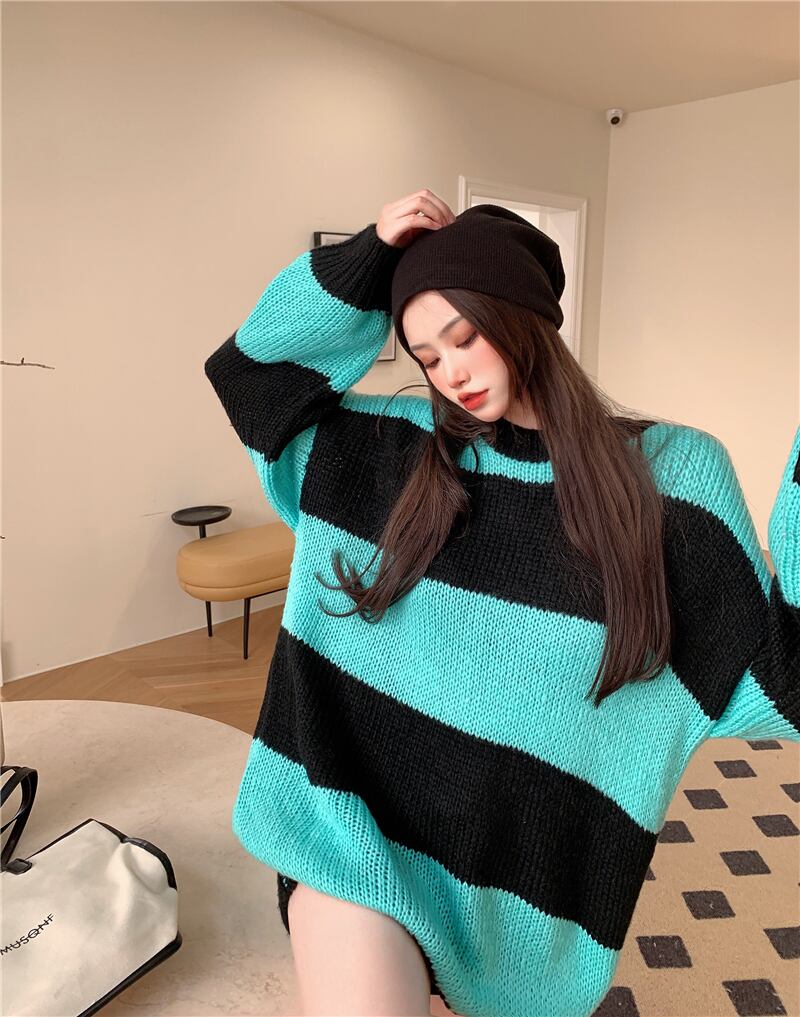 ルーズストライプセーター レディースニットトップス オータムプルオーバー スタンダードジャケット ロング ピンク レトロ 秋物 ウィンター 冬物 Xiaofeijia42038568471