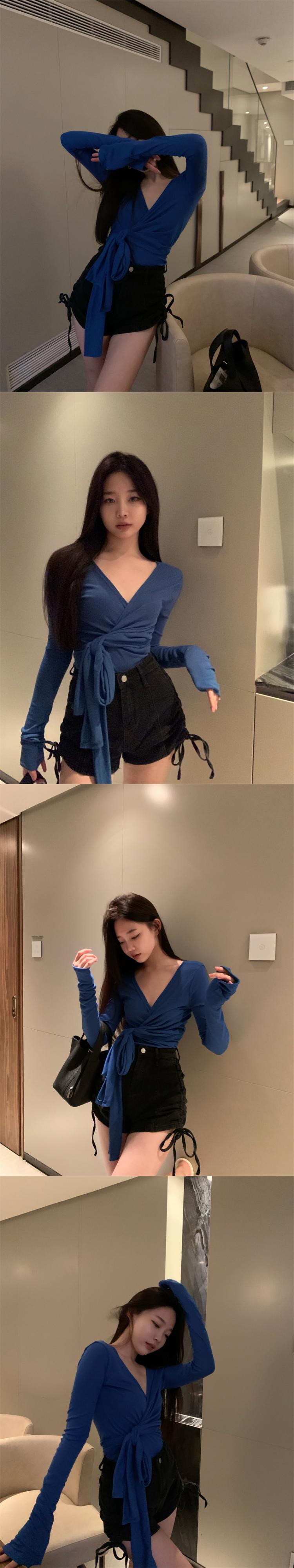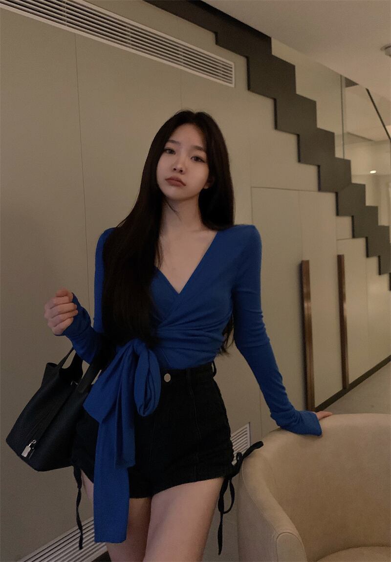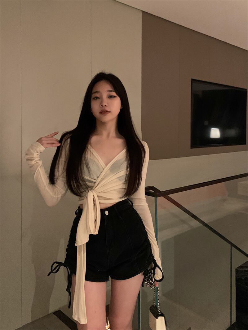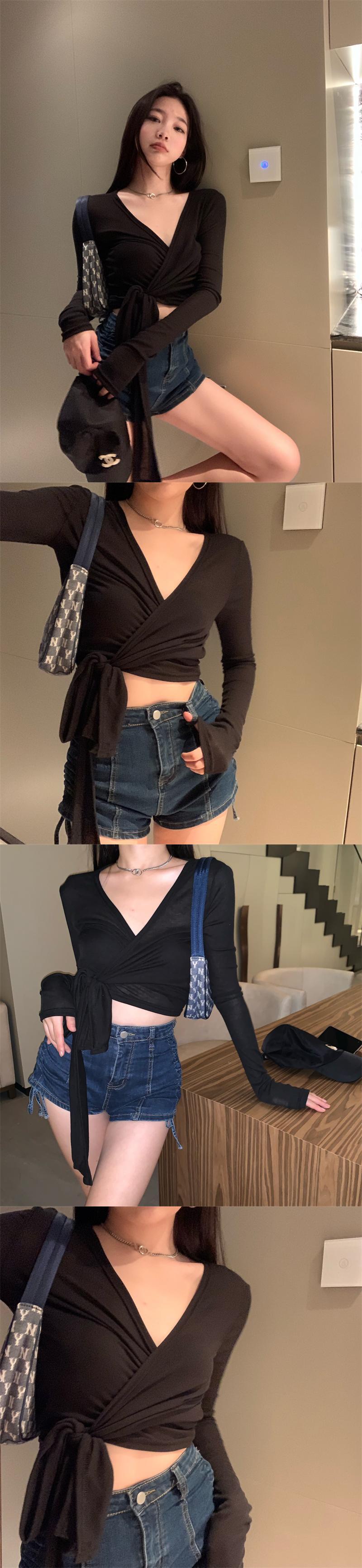 クロスVネックTシャツ オータムクロップトップ トップス スリム薄手ギャザーショーツ ロング 秋物 ブルマー Xiaofeijia3046393504