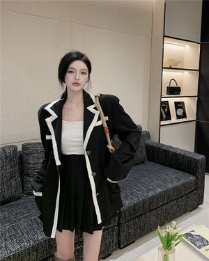 ブラックホワイトカラージャケット スプリングオータムルーズトップス 春物 秋物 Xiaofeijia7780715602