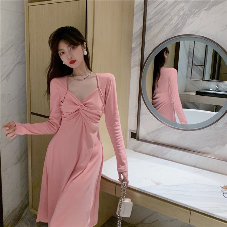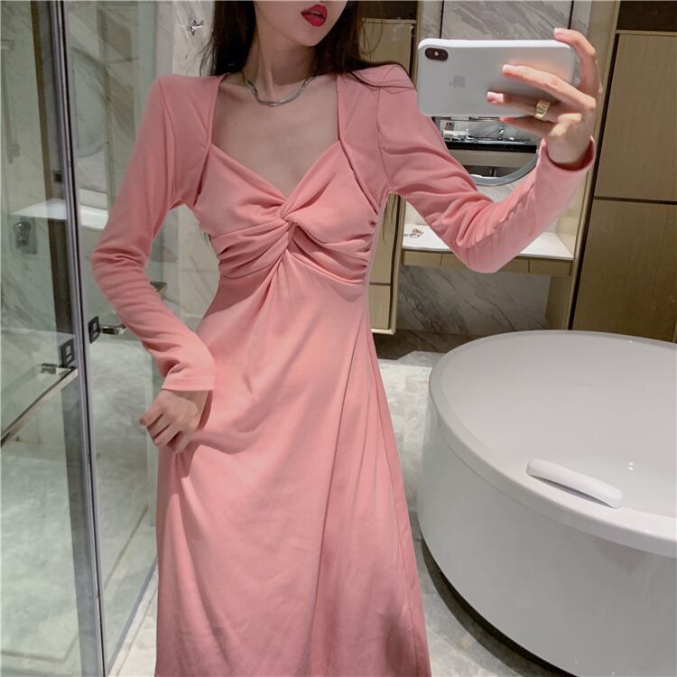 長袖スリーブドレス 薄手スリムスカート ロング スクウェア Xiaofeijia96122434734