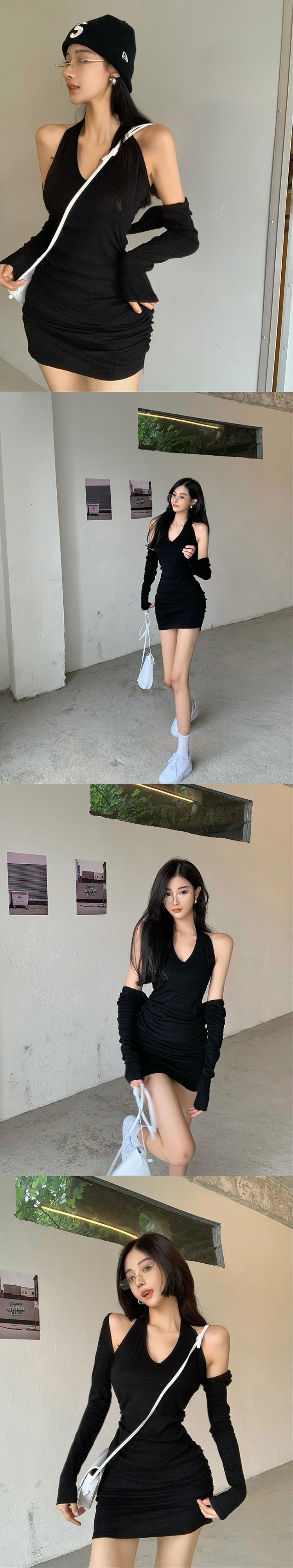 オータムVネックホルタードレス ショートスカート ロング 秋物 Xiaofeijia19226805770