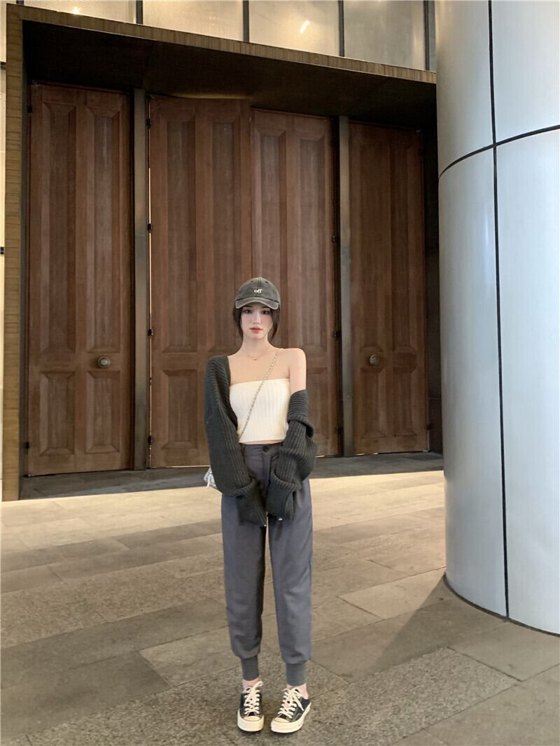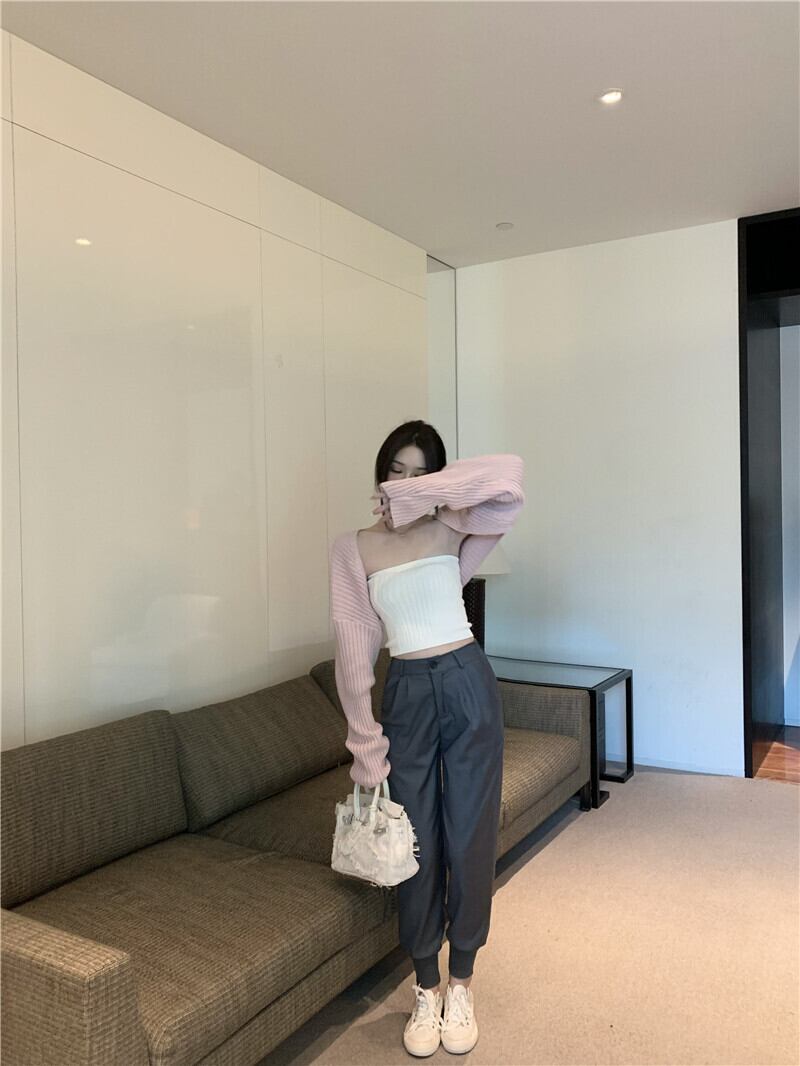 色:白いチューブトップ,グレーブラウス,ピンクのスモック,グレーのスラックス