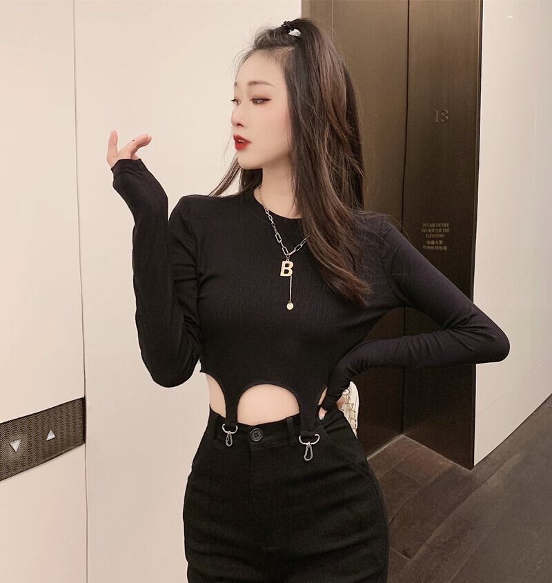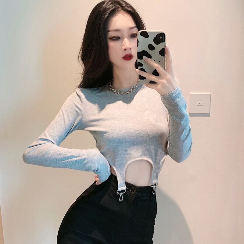 シャツ Tシャツ レディーススリムメタルバックルクロップドトップス ロング Xiaofeijia68503701070