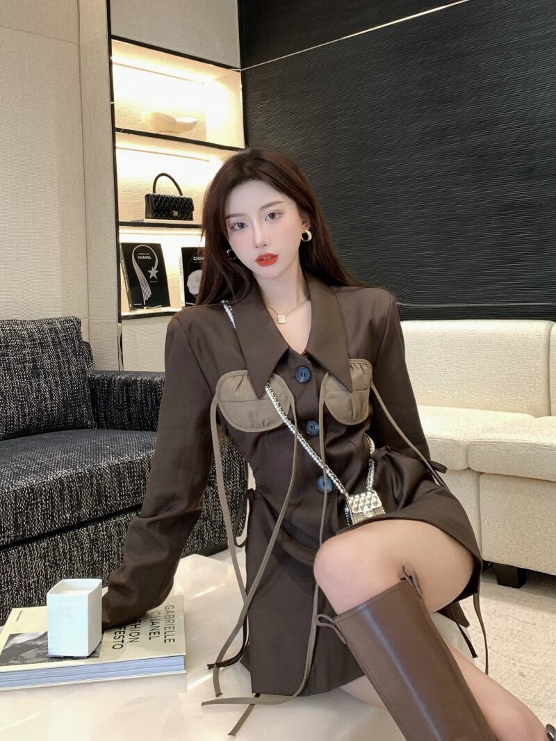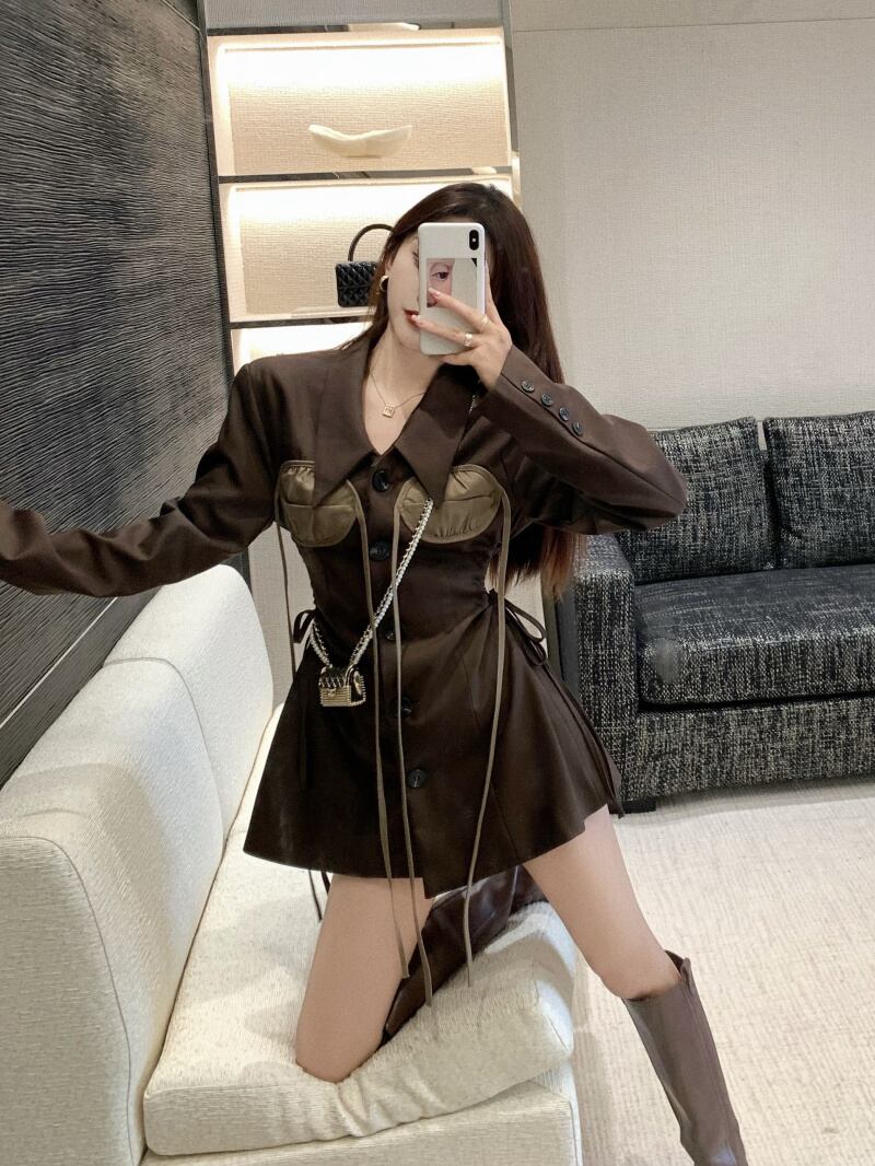 スタンダードカラージャケット スプリングオータム薄手ギャザーウェストスタイル ロング レトロ 春物 秋物 Xiaofeijia86687306113