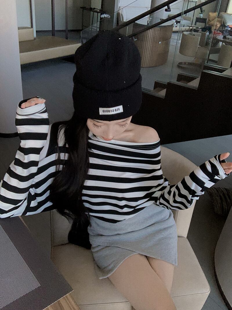 ストライプブラックホワイトルーズトップス Tシャツ Xiaofeijia44380933979