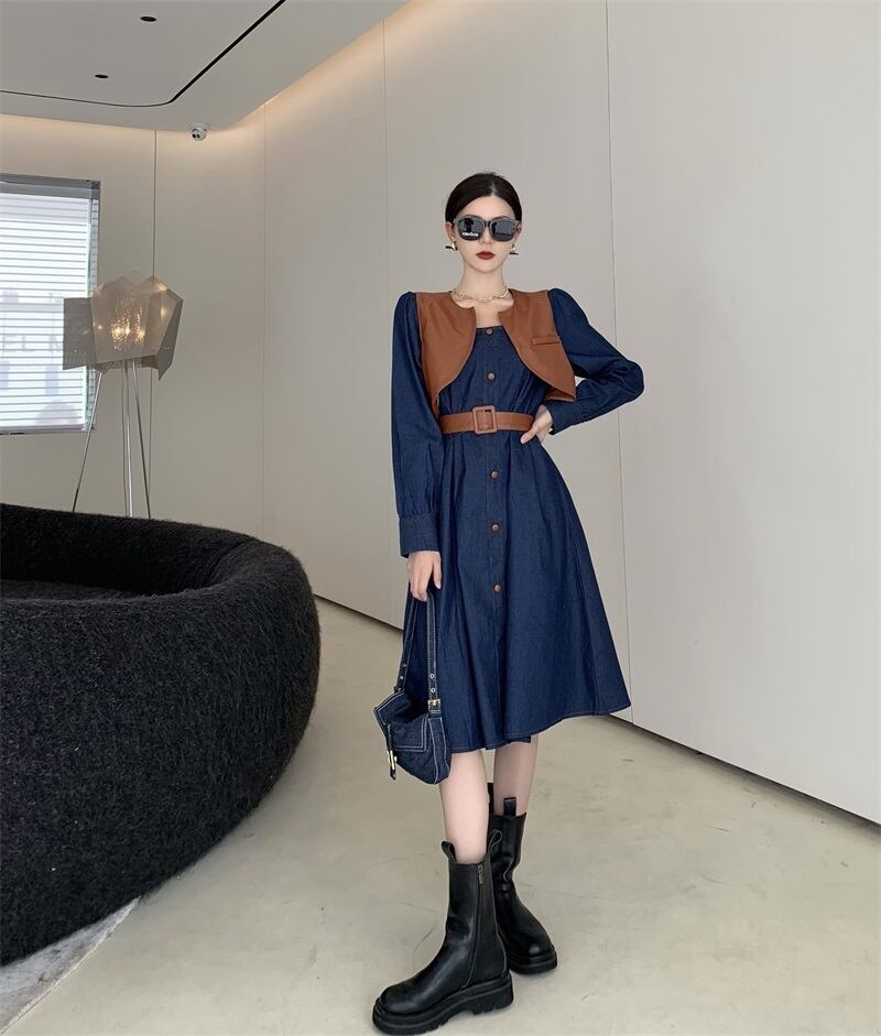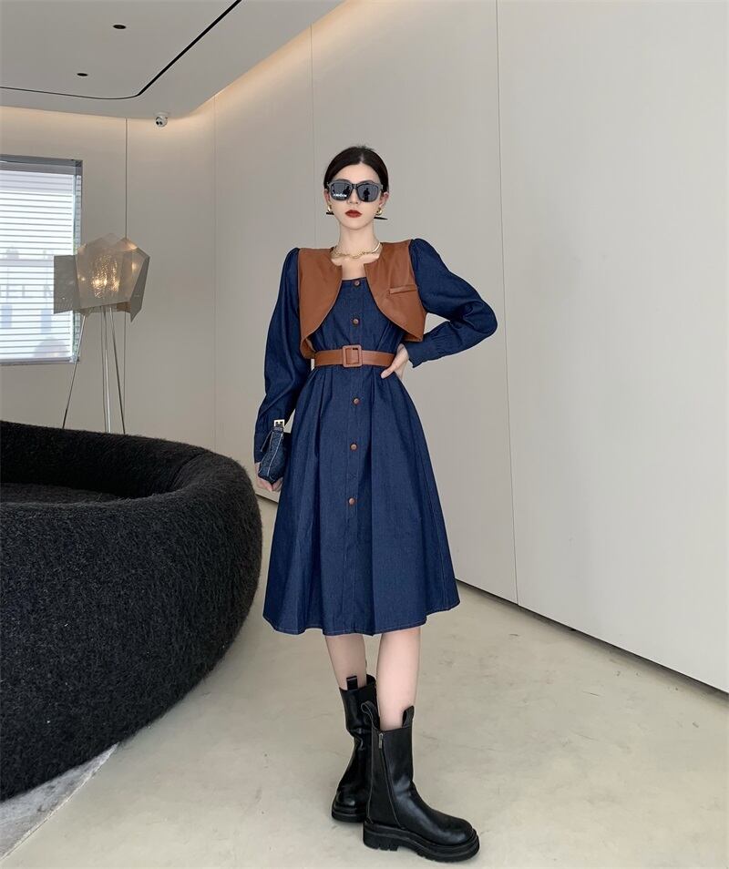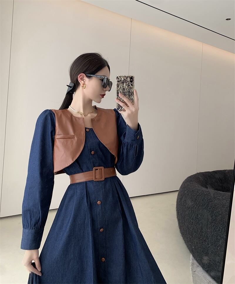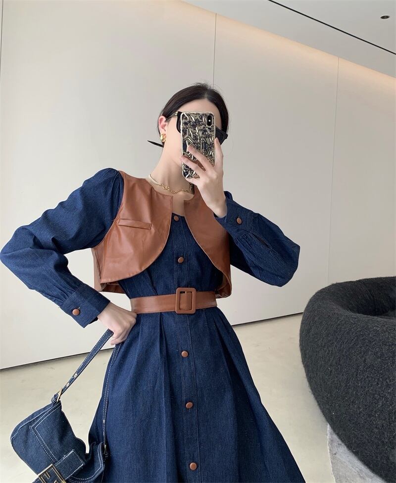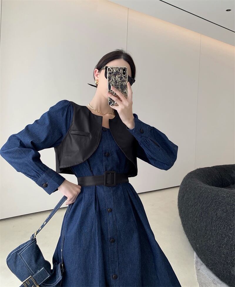 色:カーキデニムドレス,ブラックボタンデニムワンピース,ベルト付きカーキベスト,ベルトを送る黒のベスト