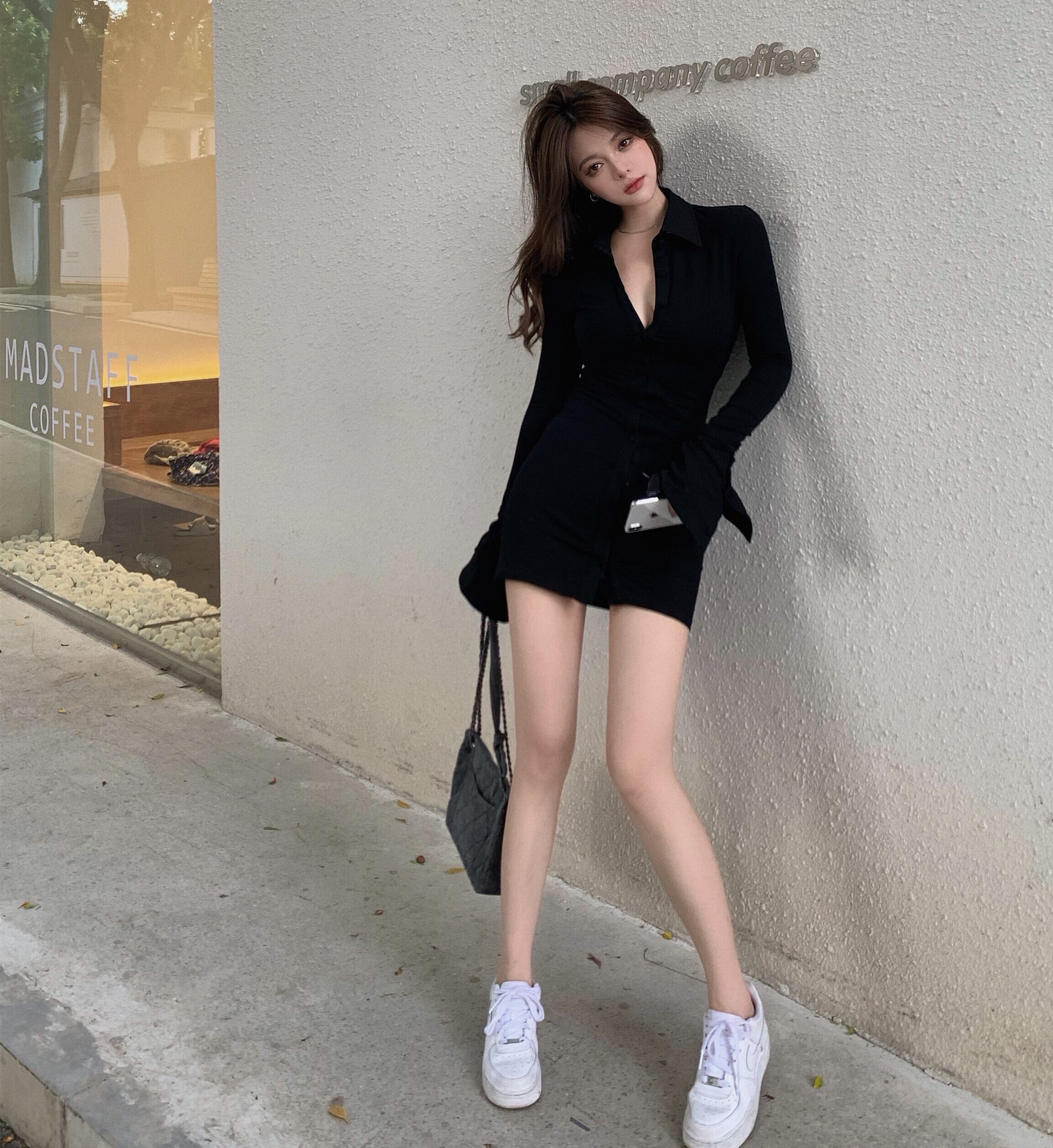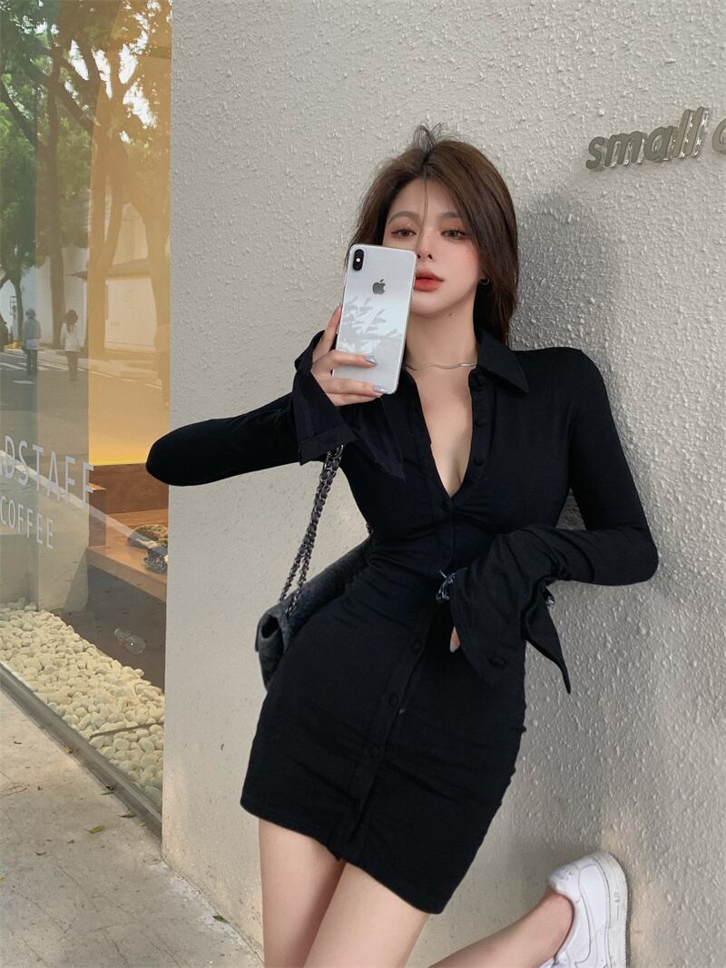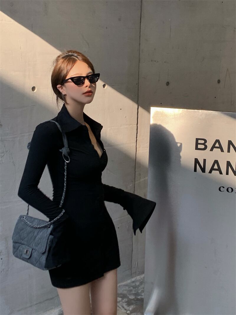 オータムスリーブブラックドレス ショート レッド 秋物 Xiaofeijia24144713376