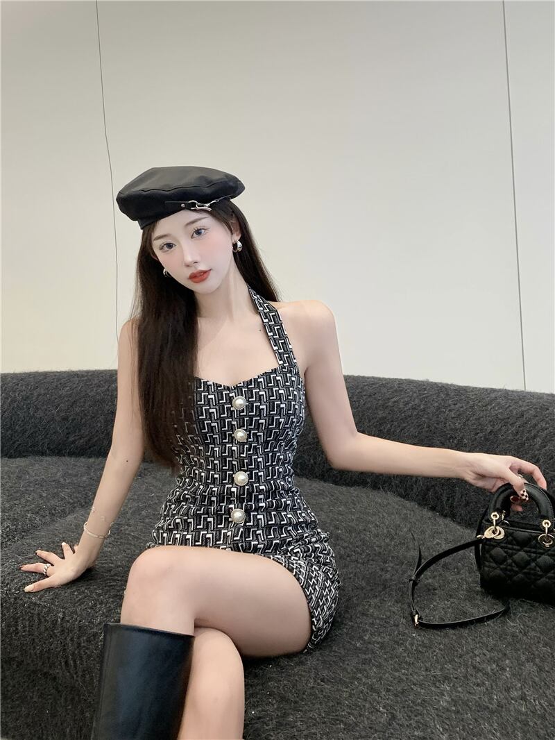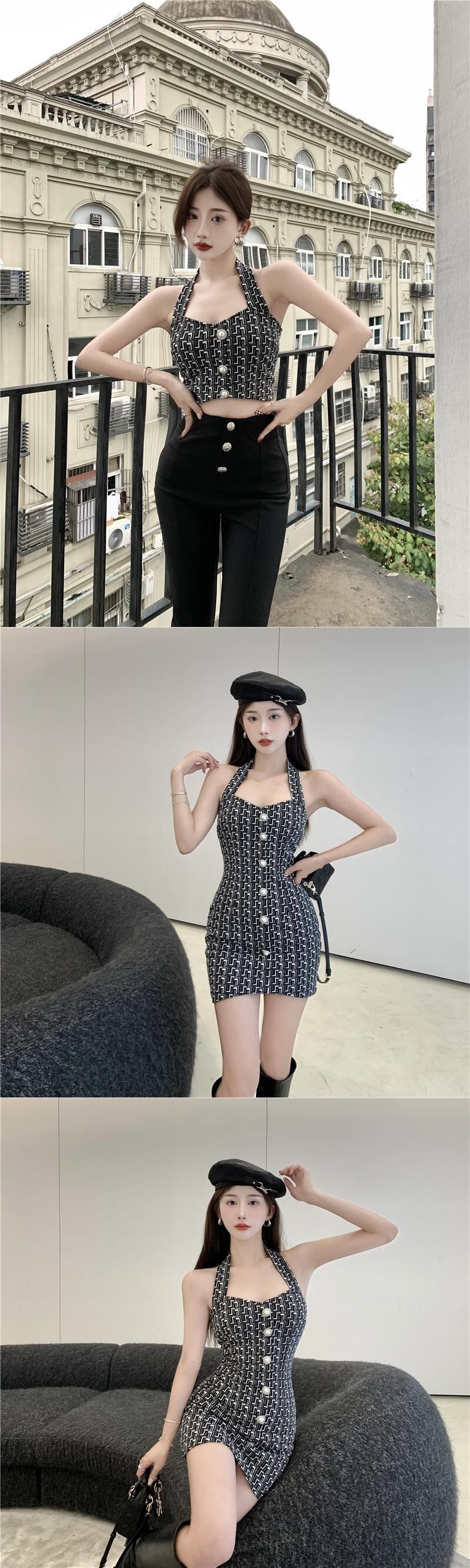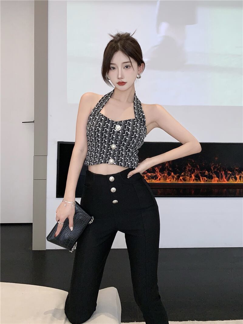オータムプリントホルタートップス パールバックル 秋物 真珠 Xiaofeijia35295748337