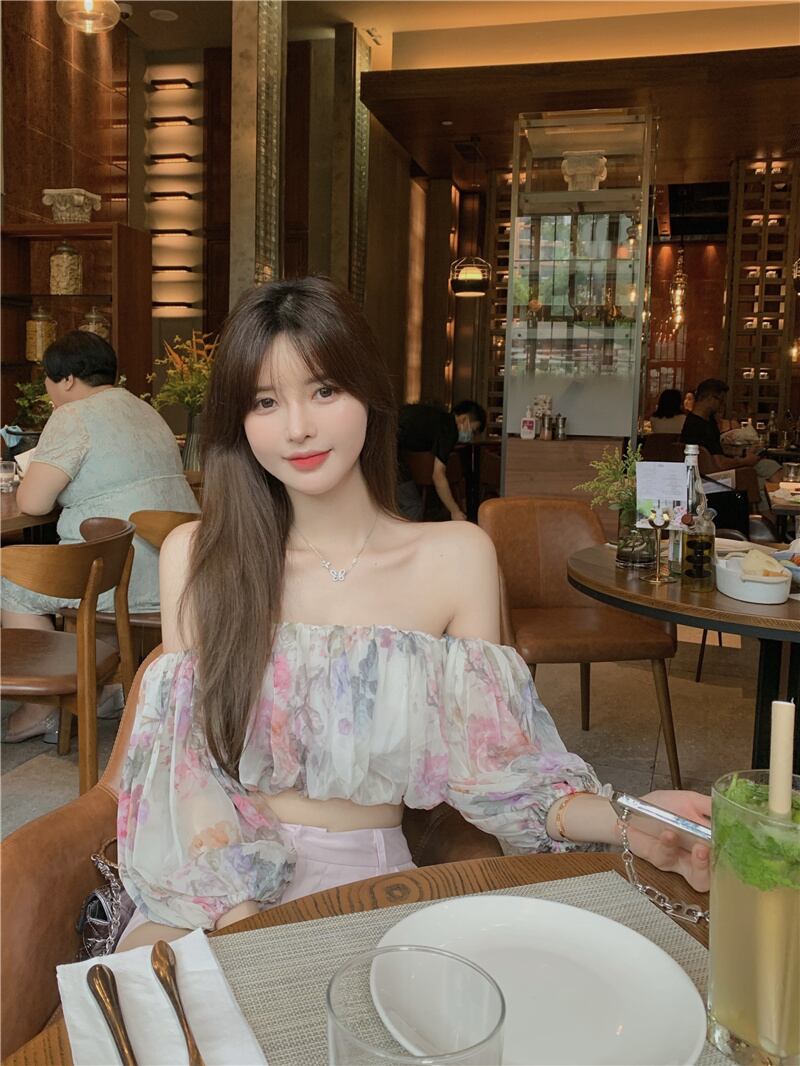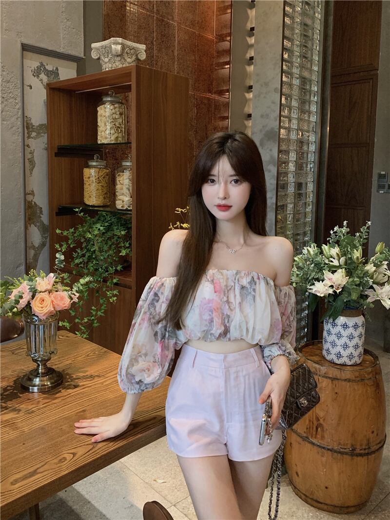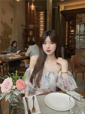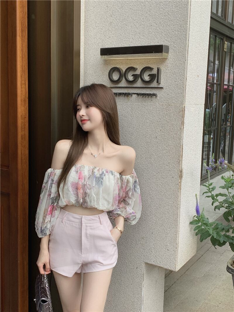 フローラルショートシャツ サマーストラップレスシフォントップス 夏物 花柄 Xiaofeijia3576438169