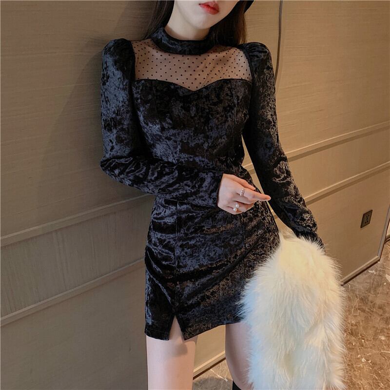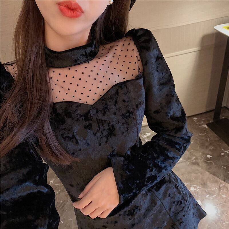 スプリングオータム水玉メッシュ長袖スリーブベルベットAラインショートドレス ロング 春物 秋物 ステッチ Xiaofeijia55010702305