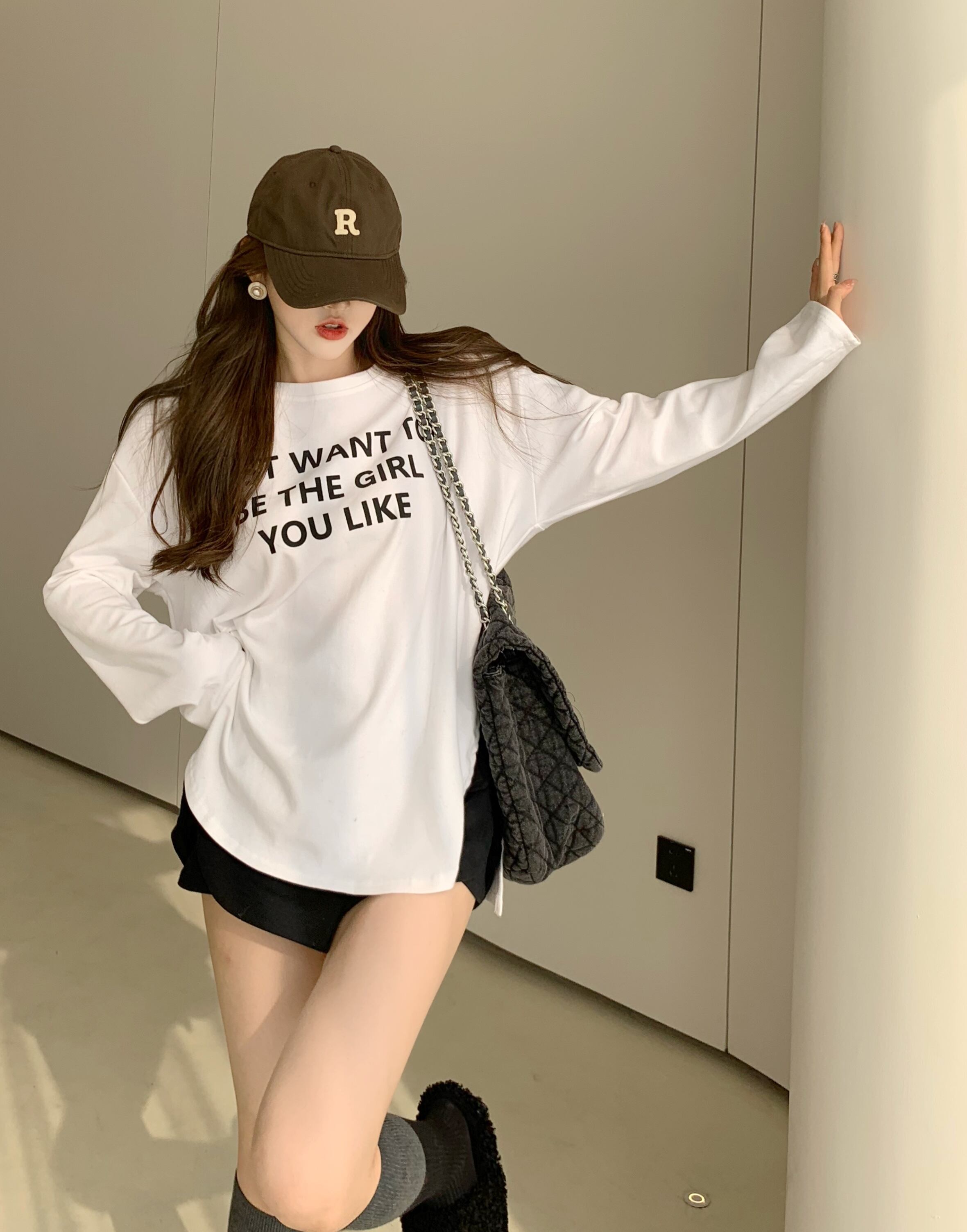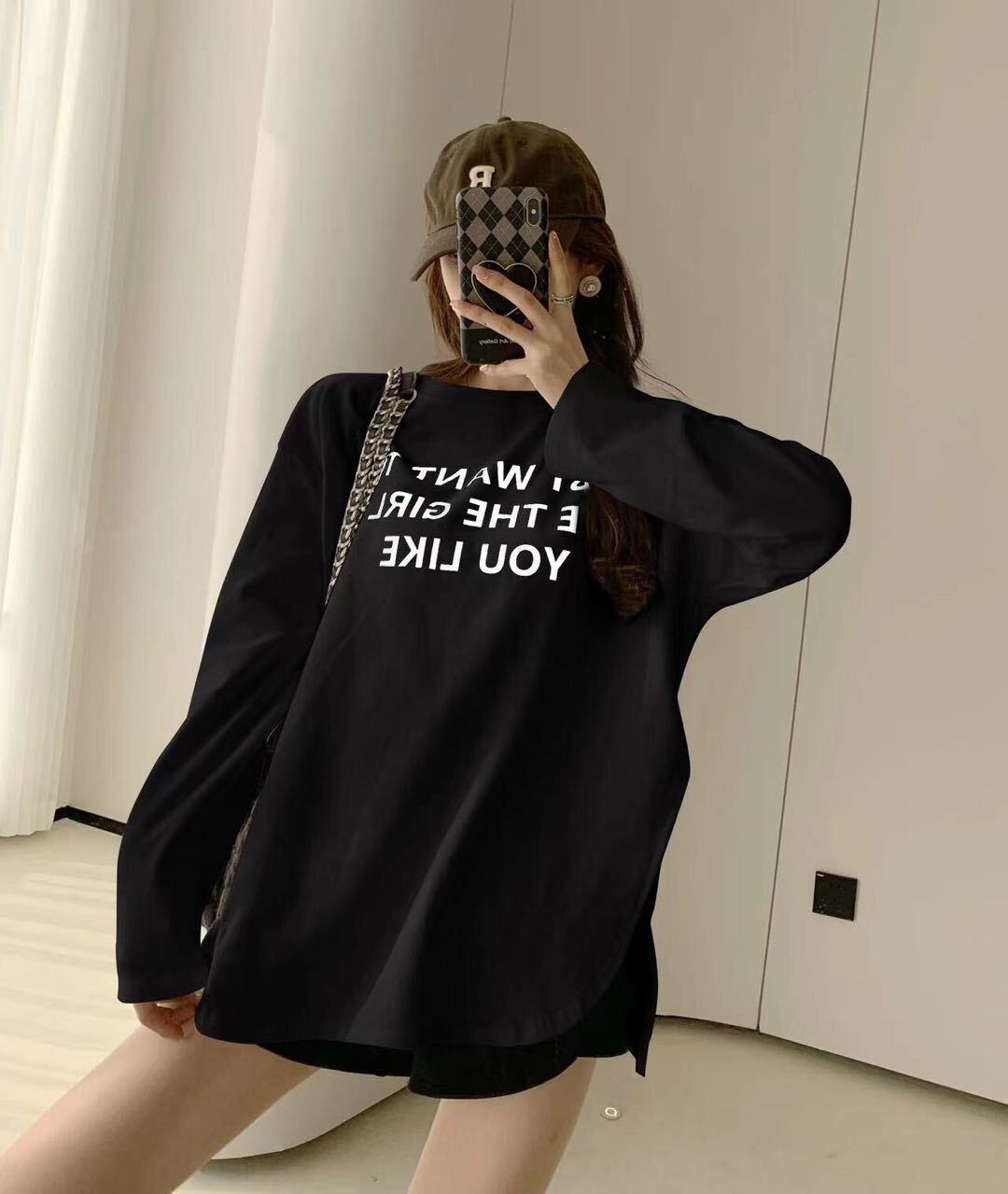 スタイルベルベットプリントラウンドネックプルオーバー サイドスリットTシャツ ロング Oネック Xiaofeijia80250680494