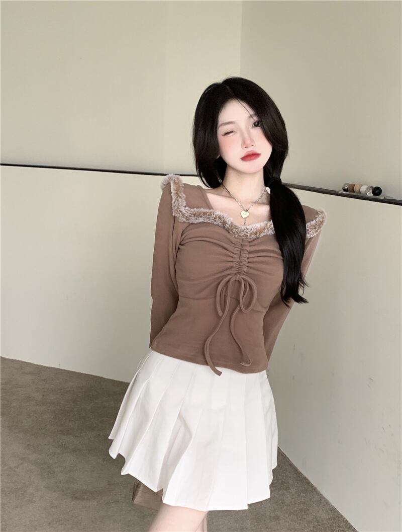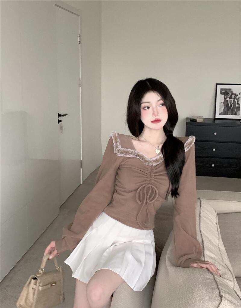 Vネッククロップドトップス ギャザースリーブソリッド カラーTシャツ ランタンスリーブ ソリッドカラー ステッチ Xiaofeijia15971415638