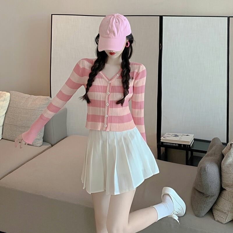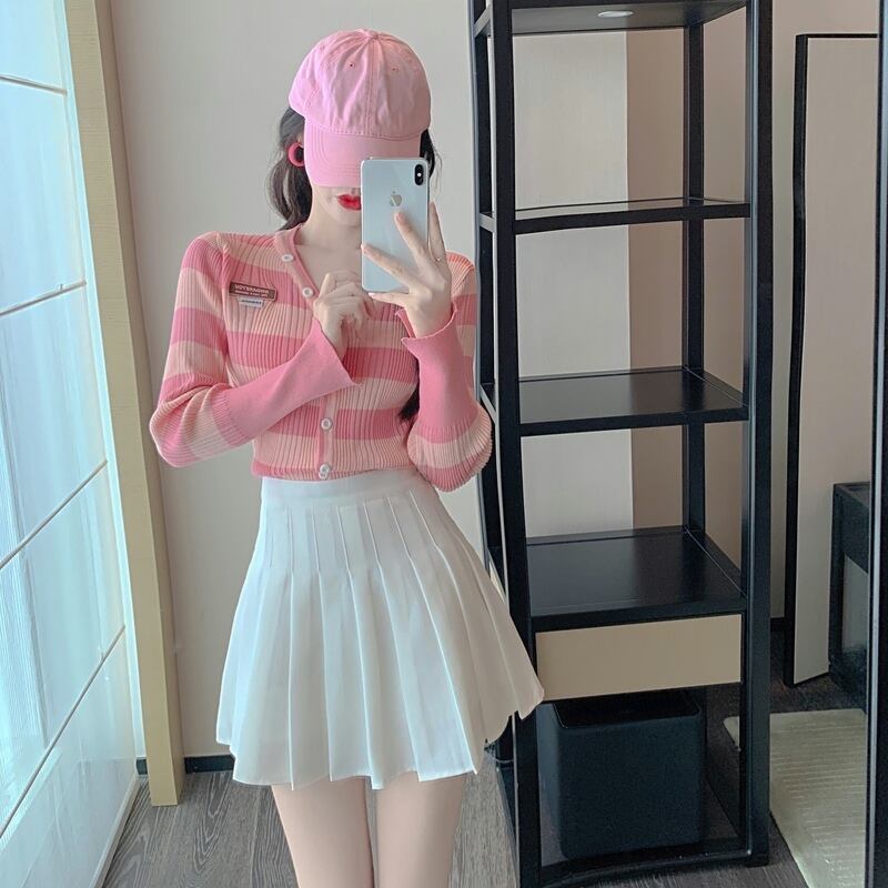 色:ピンクのストライプカーディガンコート,白いプリーツスカート