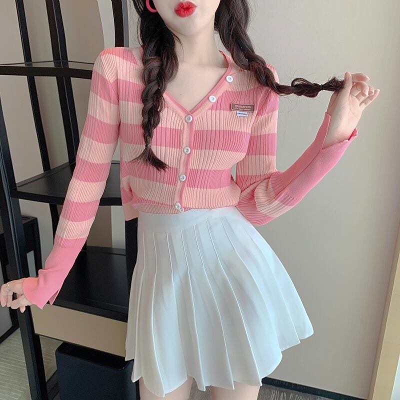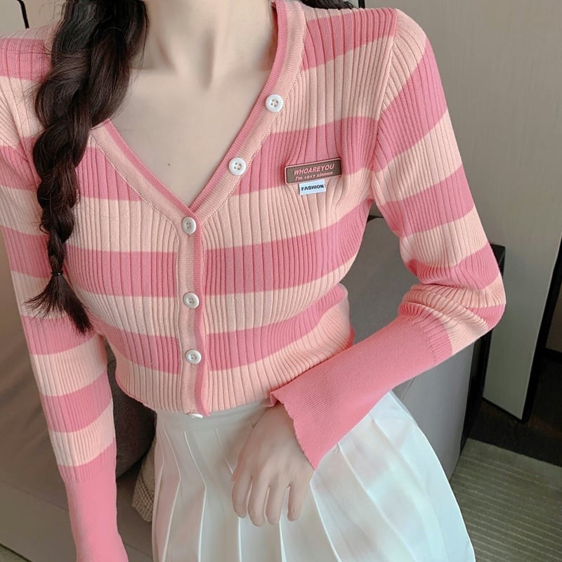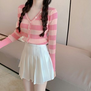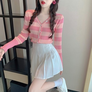 オータムストライプセーター レディース薄手カーディガンジャケット 長袖スリーブVネックスリムクロップトップ トップス ロング ピンク 大人ガーリー スウィート キュート カジュアル 秋物 Xiaofeijia3419877421