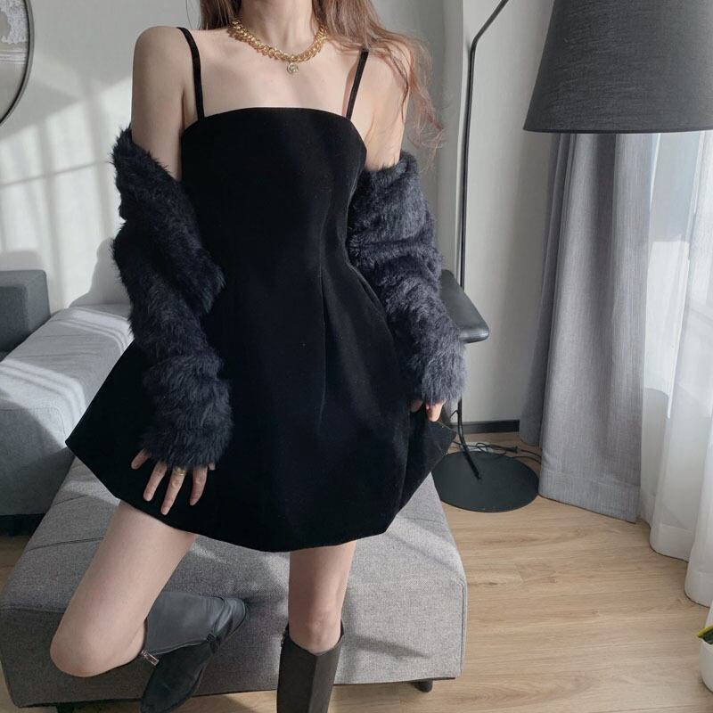 ブラックベルベットドレス レディースオータムウィンタースタイルウェストAラインミニショートスカート 秋物 冬物 Xiaofeijia20602160548