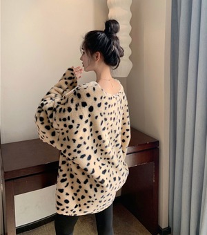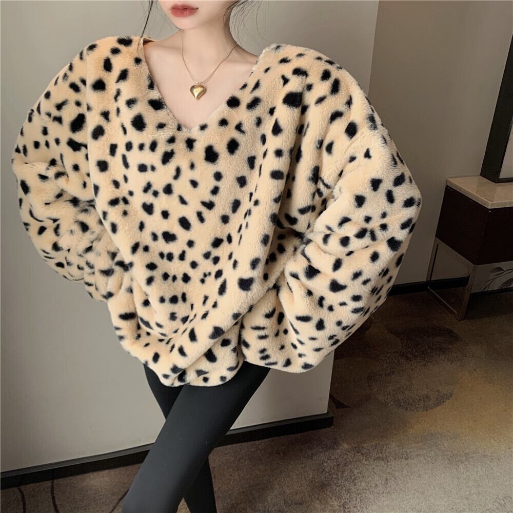 ルーズVネックレオパードプリント柄セーター レディースオータムウィンターシャツ ロング ストリート 大きめサイズ 秋物 冬物 Xiaofeijia56348138025