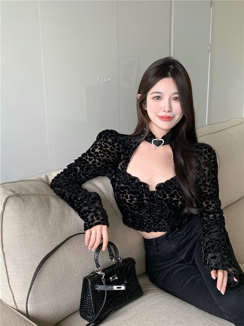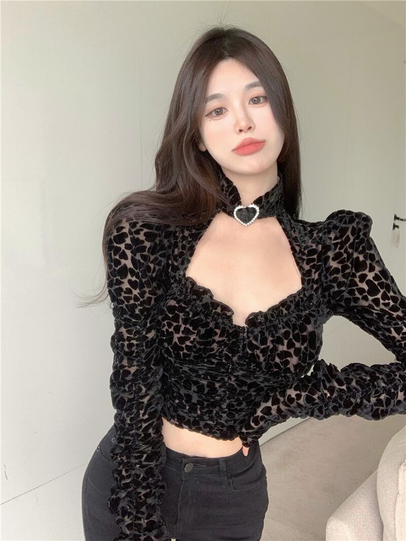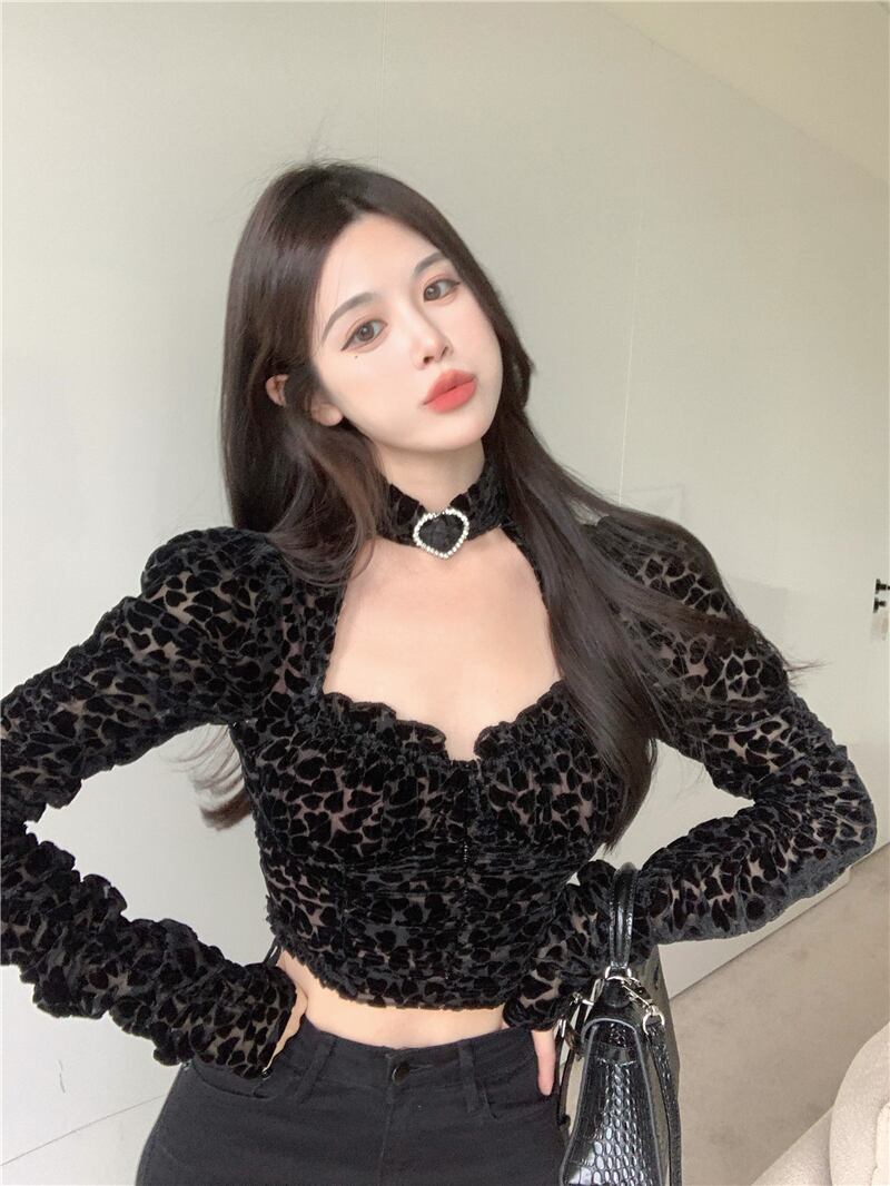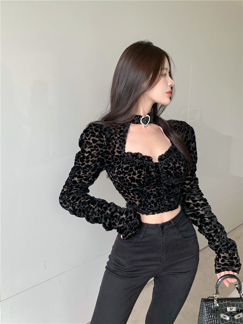 プリーツTシャツ オータムスリーブハイウェストウェストショートトップス 秋物 Xiaofeijia73341918187